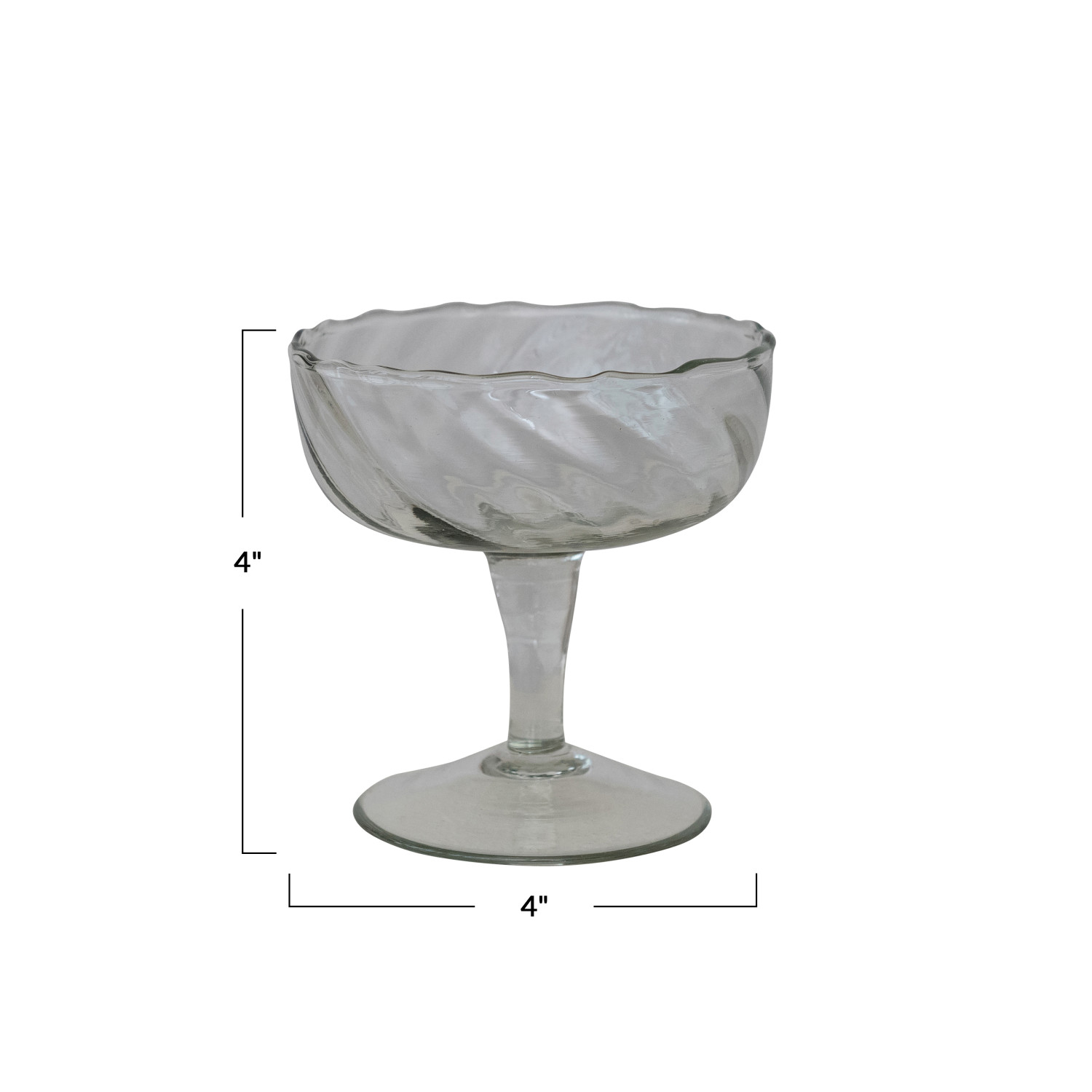 Catalog Name: Approximately 4" Round x 4"H 6 oz. Hand-Blown Twisted Stemmed Coupe Glass (Each One Will Vary)