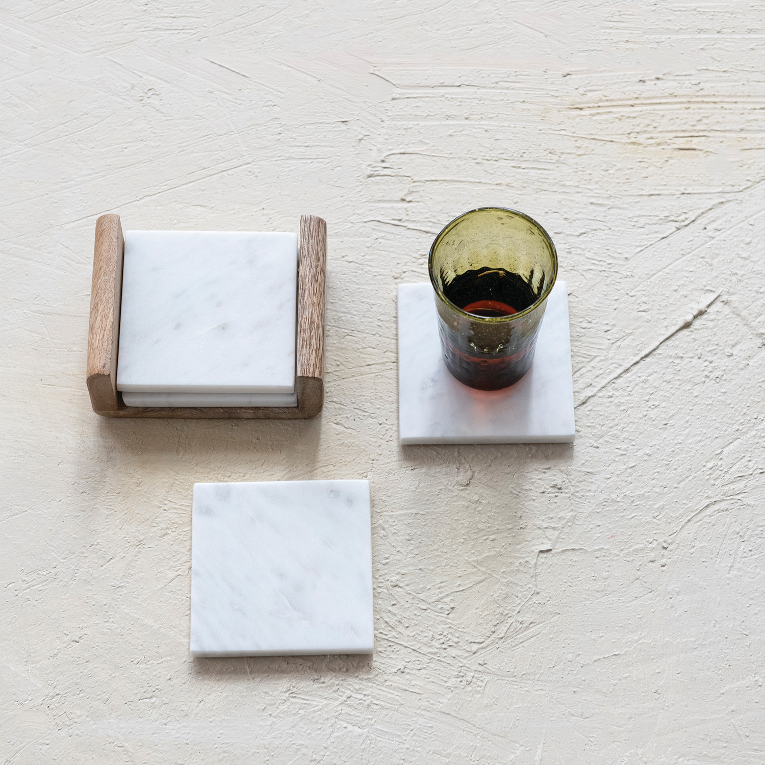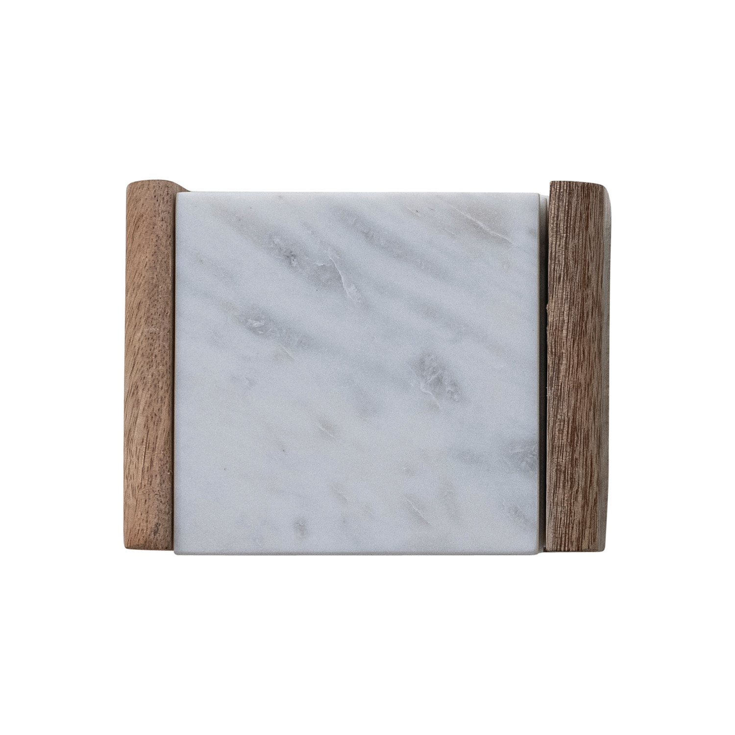 Catalog Name: 4" Square Marble Coasters w/ Mango Wood Holder, White & Natural, Set of 5
