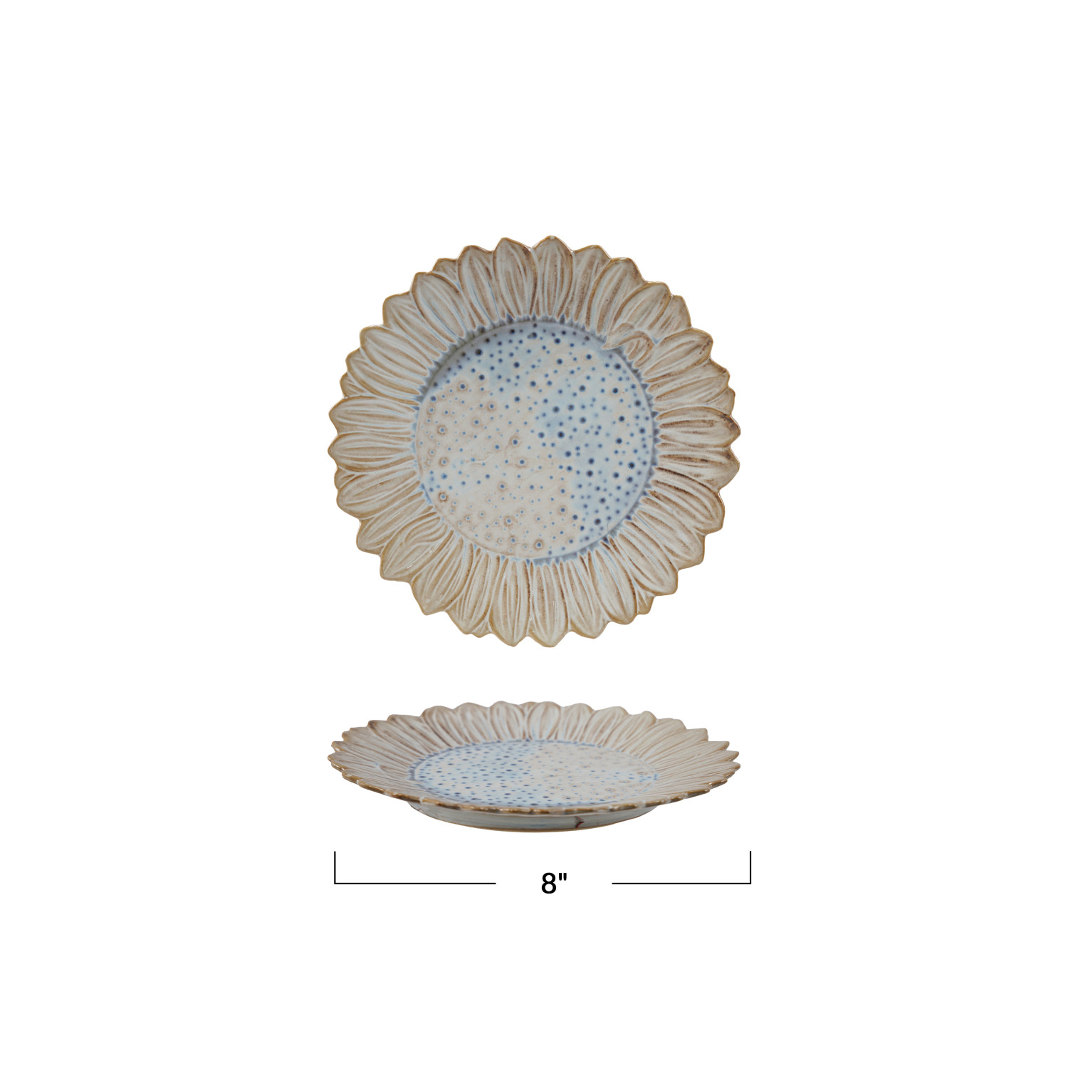 Catalog Name: 8" Round Stoneware Flower Shaped Plate, Reactive Glaze, White & Blue (Each One Will Vary)