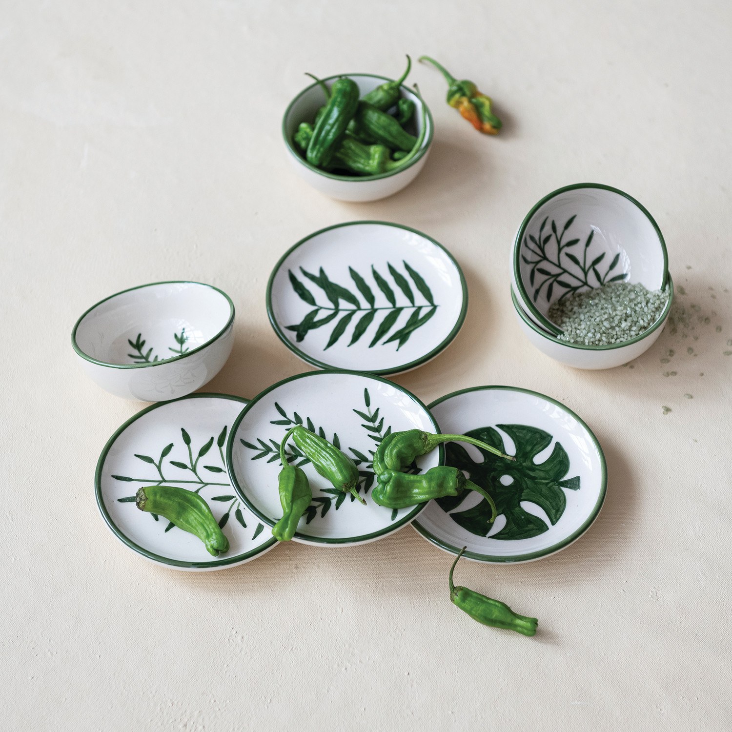 Catalog Name: 4" Round x 1-3/4"H Hand-Painted Stoneware Bowl w/ Pattern & Botanical Inside, Cream Color & Dark Green, 4 Styles (Each One Will Vary)