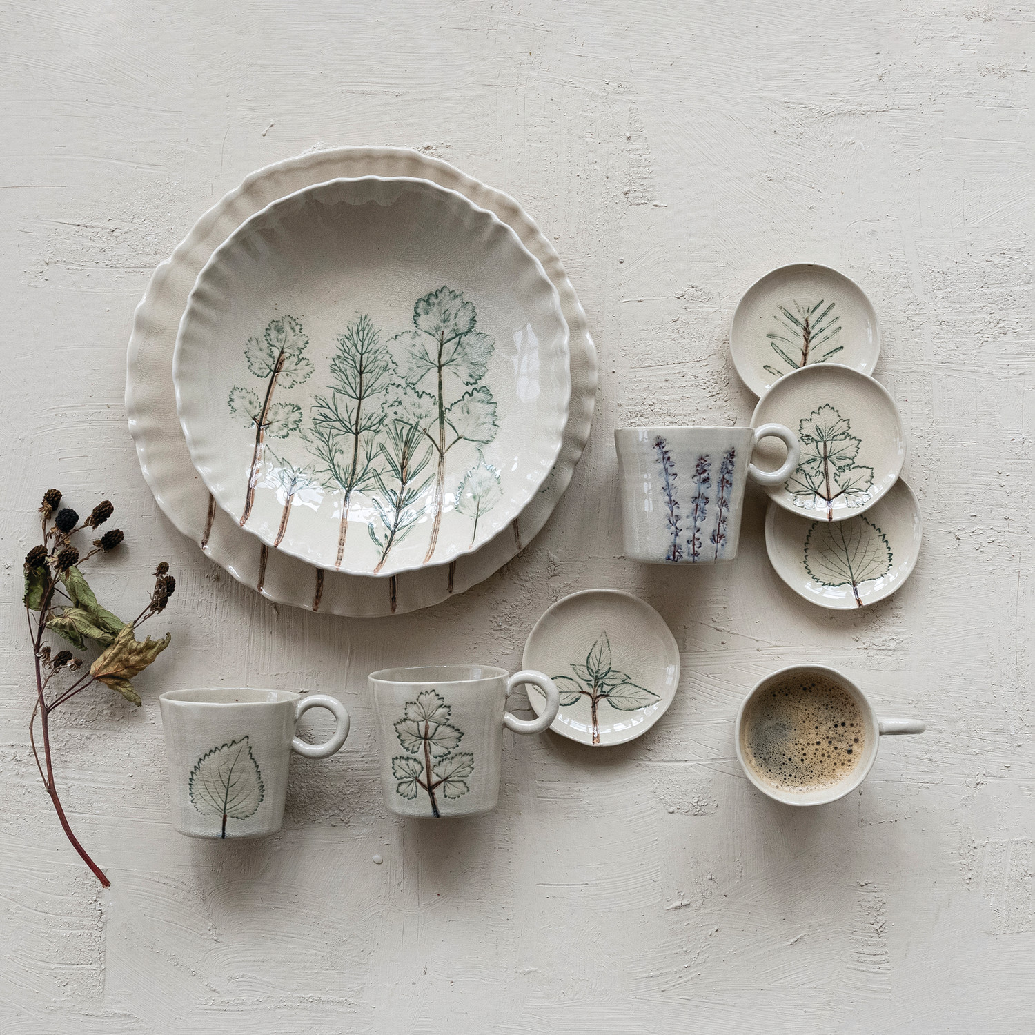 Catalog Name: 10" Round Hand-Painted Stoneware Organic Shaped Low Bowl w/ Botanicals, Crackle Glaze, Cream Color, Green & Brown (Each One Will Vary)