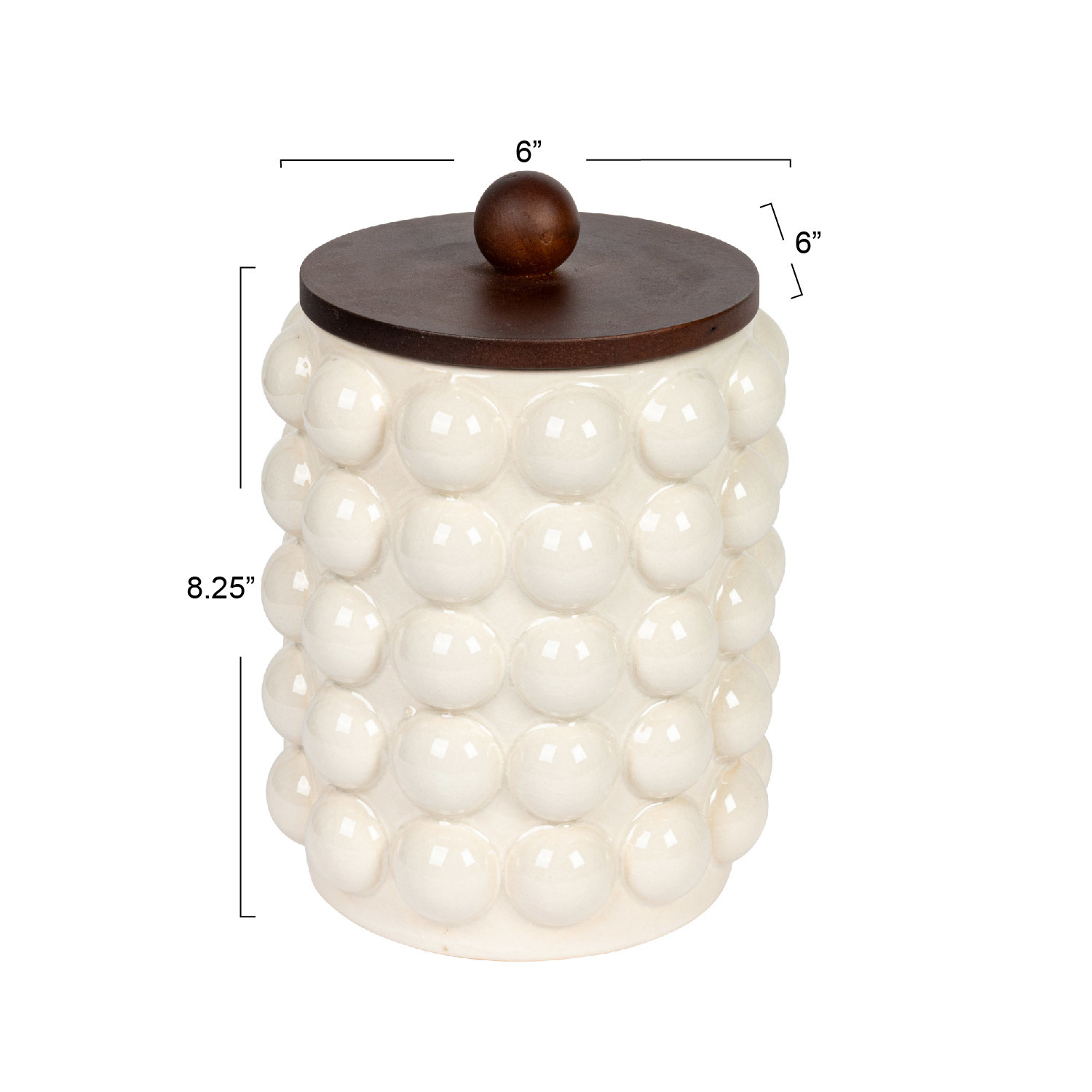 Catalog Name: 5-3/4" Round x 8-1/4"H Stoneware Canister w/ Raised Dots & Acacia Wood Lid, Crackle Glaze, White & Natural (Each One Will Vary)