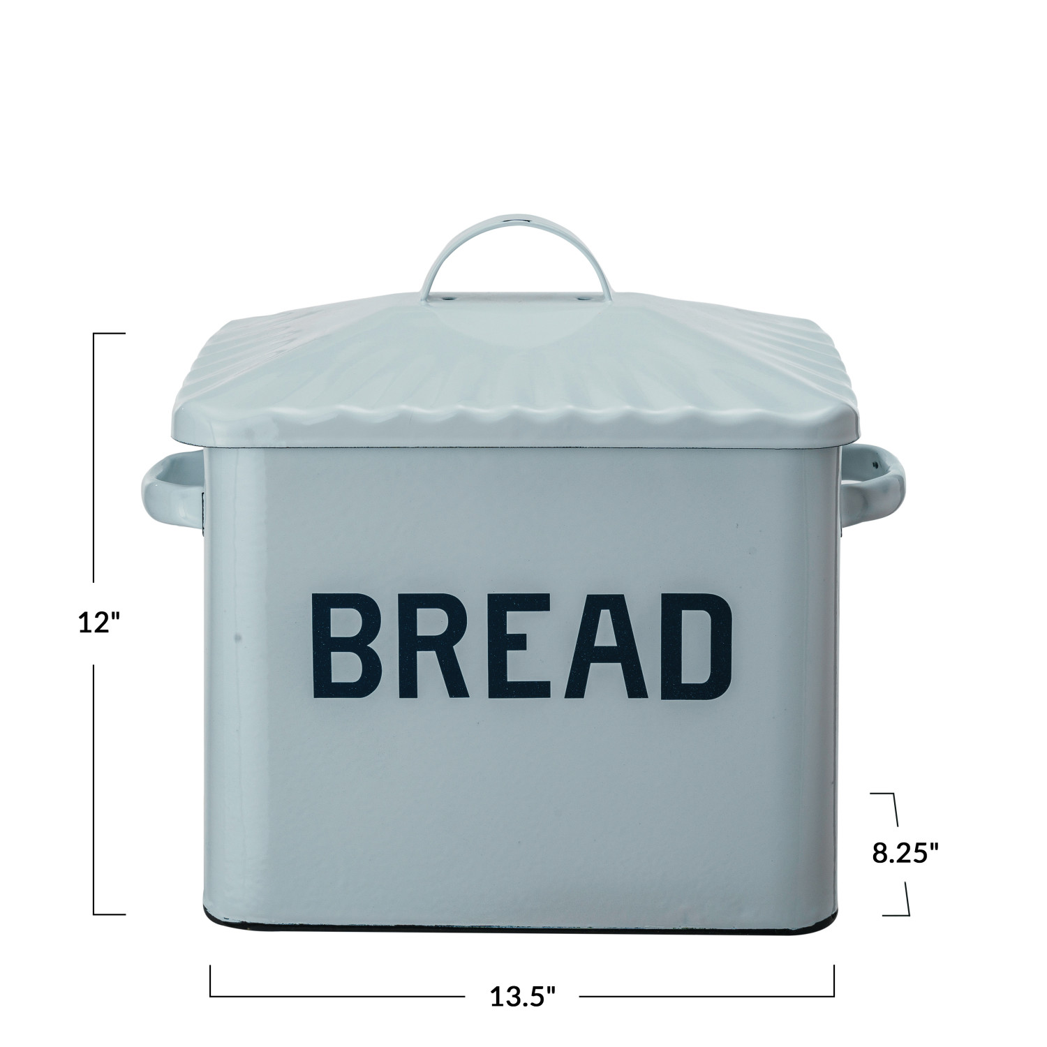 This Chic Farmhouse Enameled Bread Box is the epitome of functional elegance. The rectangular box, measuring 13.5 inches in length and 12 inches in height, is crafted from robust steel and finished with a white enamel coating. It features a scalloped lid that adds a decorative touch, while the black "Bread" text on the front offers a clear, charming label. Store various loaves of bread, bagels, or pastries in this stylish container to keep them fresh and easily accessible. The classic design of this bread box will complement any kitchen decor, making it a versatile and practical addition to the home. Designed to blend into a variety of decor styles, this bread box is not just a storage solution but a statement piece that brings a cozy, nostalgic feel to any kitchen.