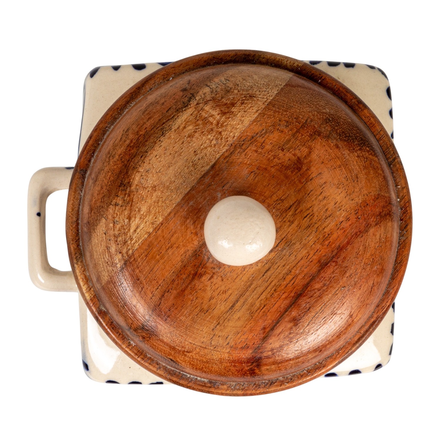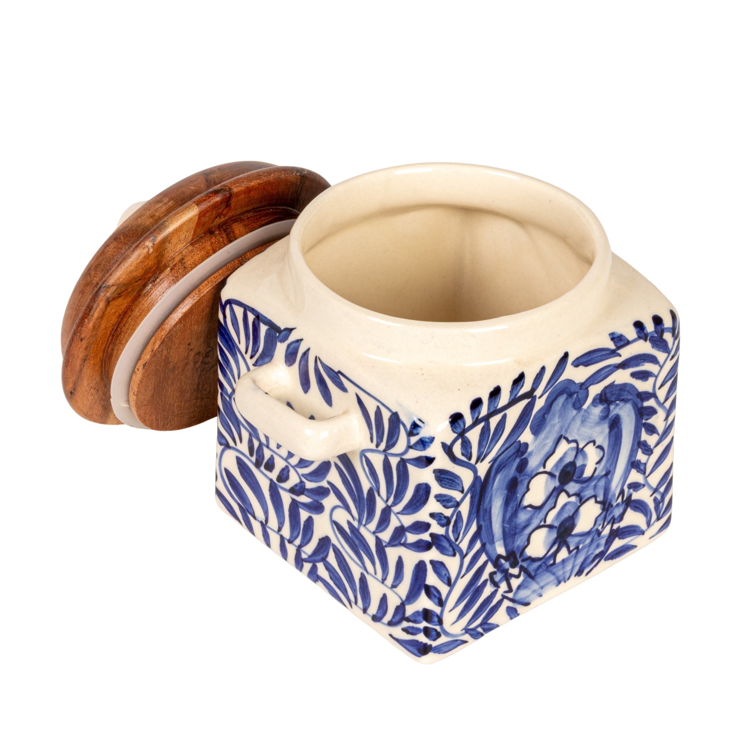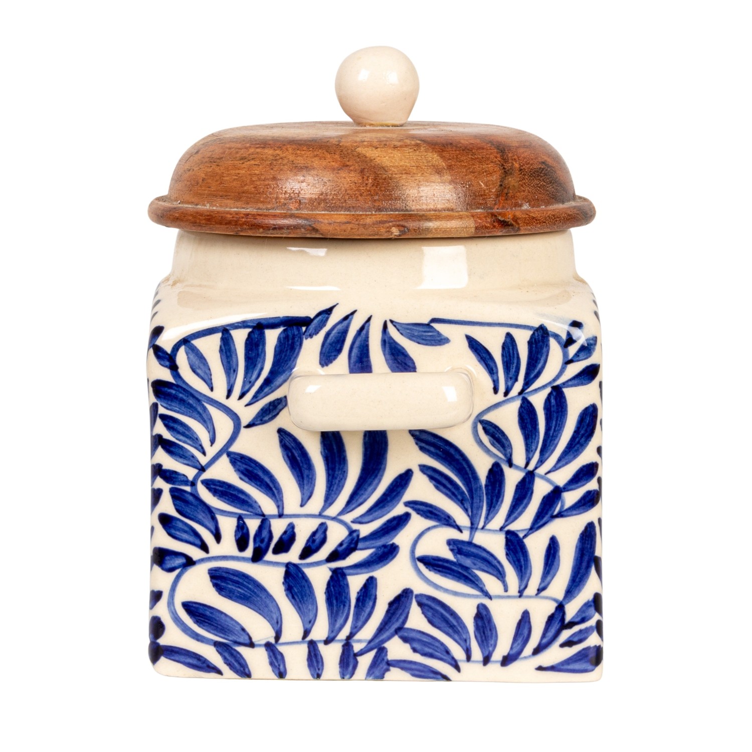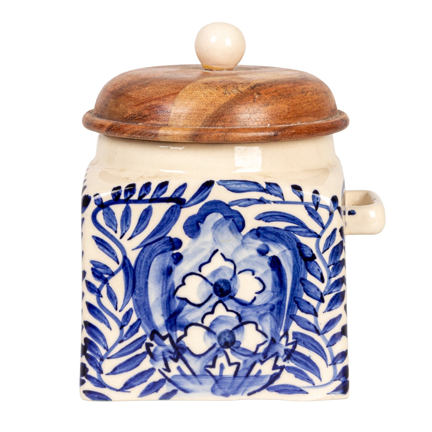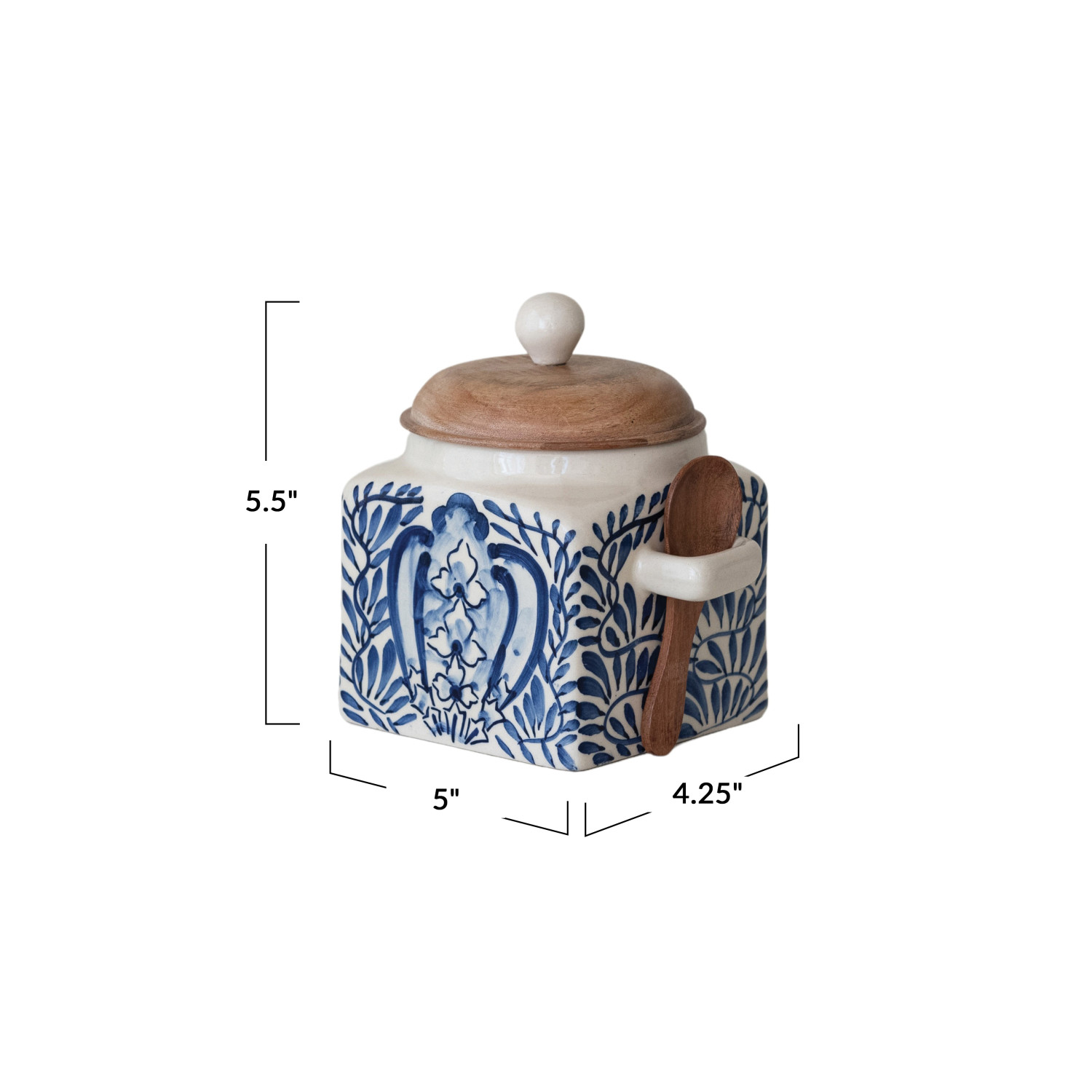 Catalog Name: 5"L x 4-1/4"W x 5-1/2"H Hand-Painted Stoneware Canister w/ Design, Acacia Wood Lid & Spoon, Cream Color, Blue & Natural, Set of 2