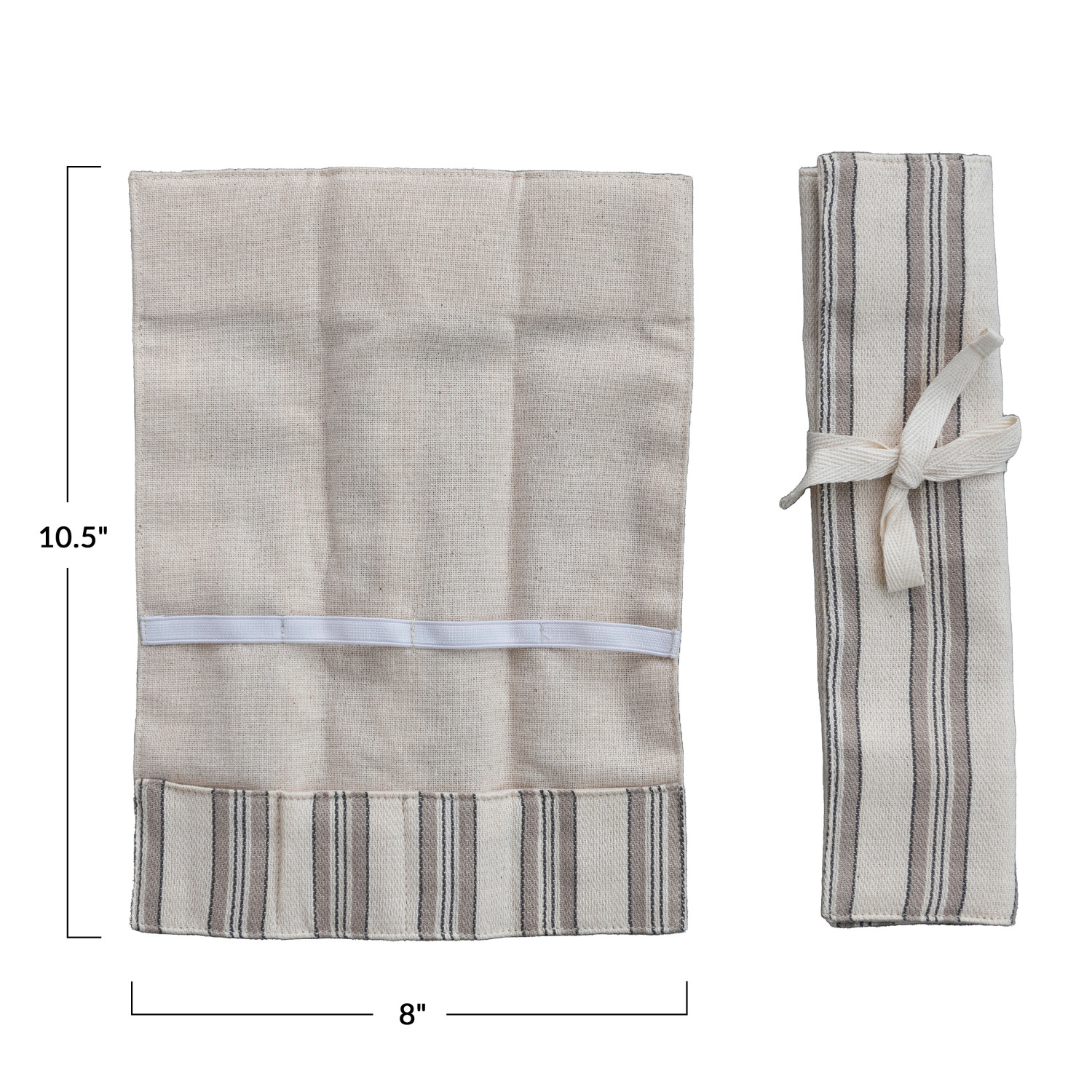 Catalog Name: 10-1/2"L x 8"W Woven Cotton Roll-up Cutlery Pouch w/ Stripes & Tie, Cream Color, Black & Natural