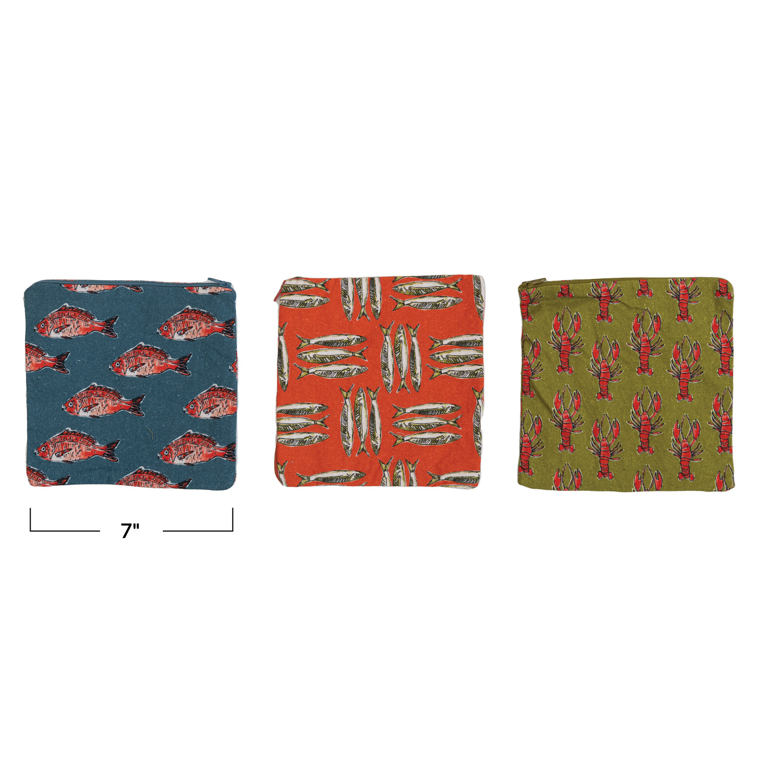Catalog Name: 7" Square Cotton Printed Zip Food Pouch w/ Sea Life Pattern & Interior Coating, Multi Color, 3 Styles ©