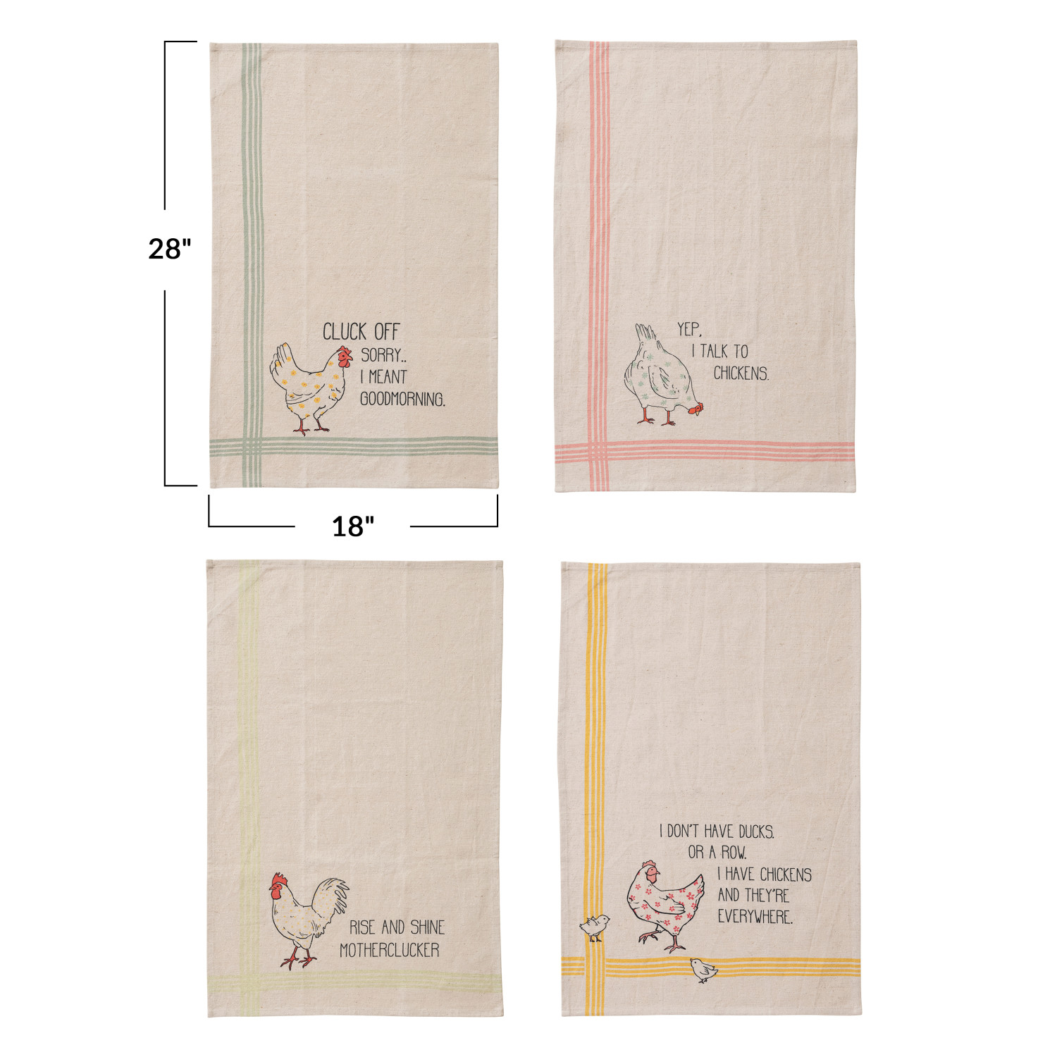 Cotton & Linen Printed Tea Towel w/ Chicken & Saying, 4 Styles