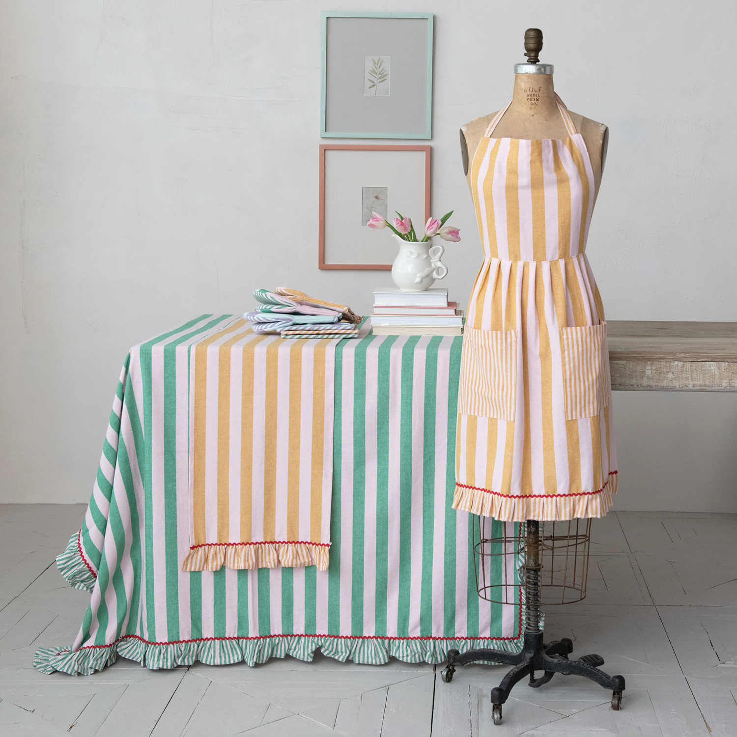 Catalog Name: 72"L x 14"W Woven Cotton Striped Table Runner w/ Ruffle & Ric Rac Trim, Mustard Color, Pink & Red