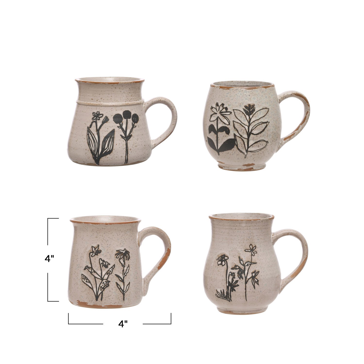 Catalog Name: 4" Round x 4"H 15 oz. Debossed Stoneware Mug w/ Flowers, Reactive Glaze, White & Black, 4 Styles (Each One Will Vary) ©