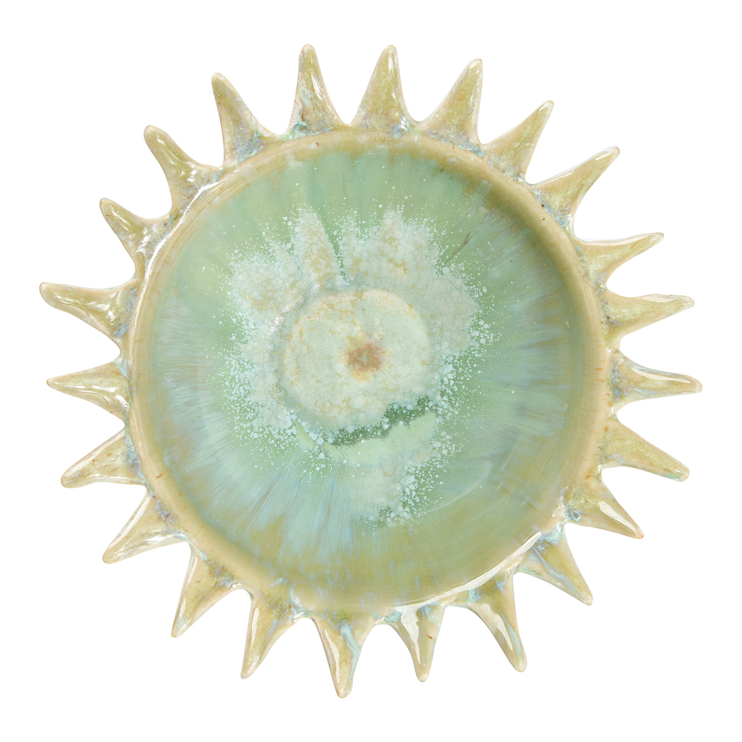 This stoneware sunburst serving bowl is a unique and beautiful piece. It's opal reactive glaze makes it perfect for a beach inspired home and its unique shape adds a sense of style to any home. This serving bowl will make a statement as a centerpiece and will add to the overall feel of any room.