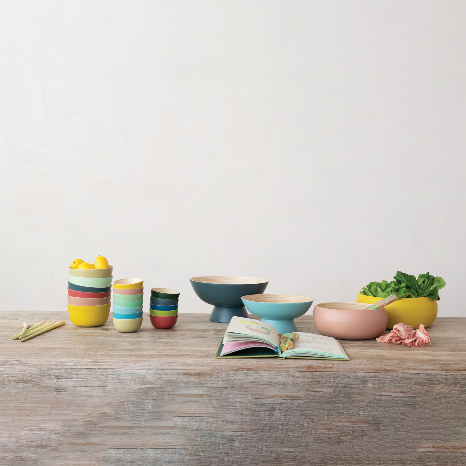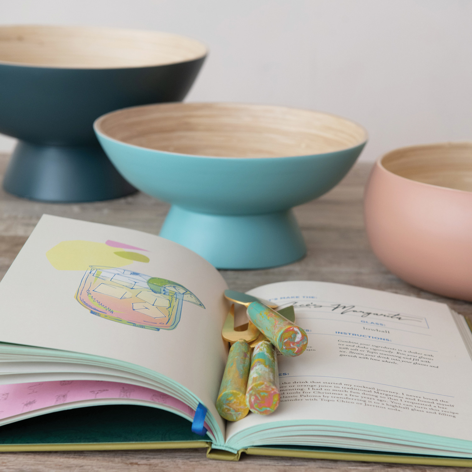 Bamboo Footed Bowl w/ Natural Finish Inside, Matte Blue