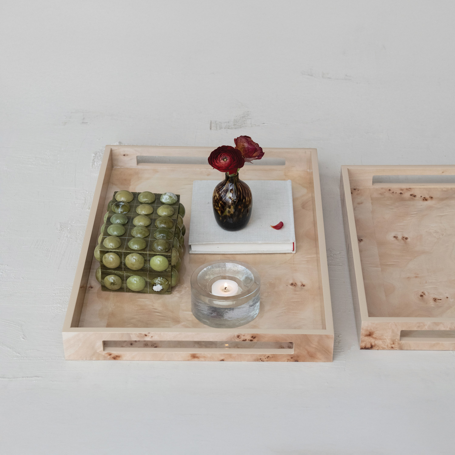 MDF & Burl Wood Veneer Trays w/ Handles, Natural, Set of 2