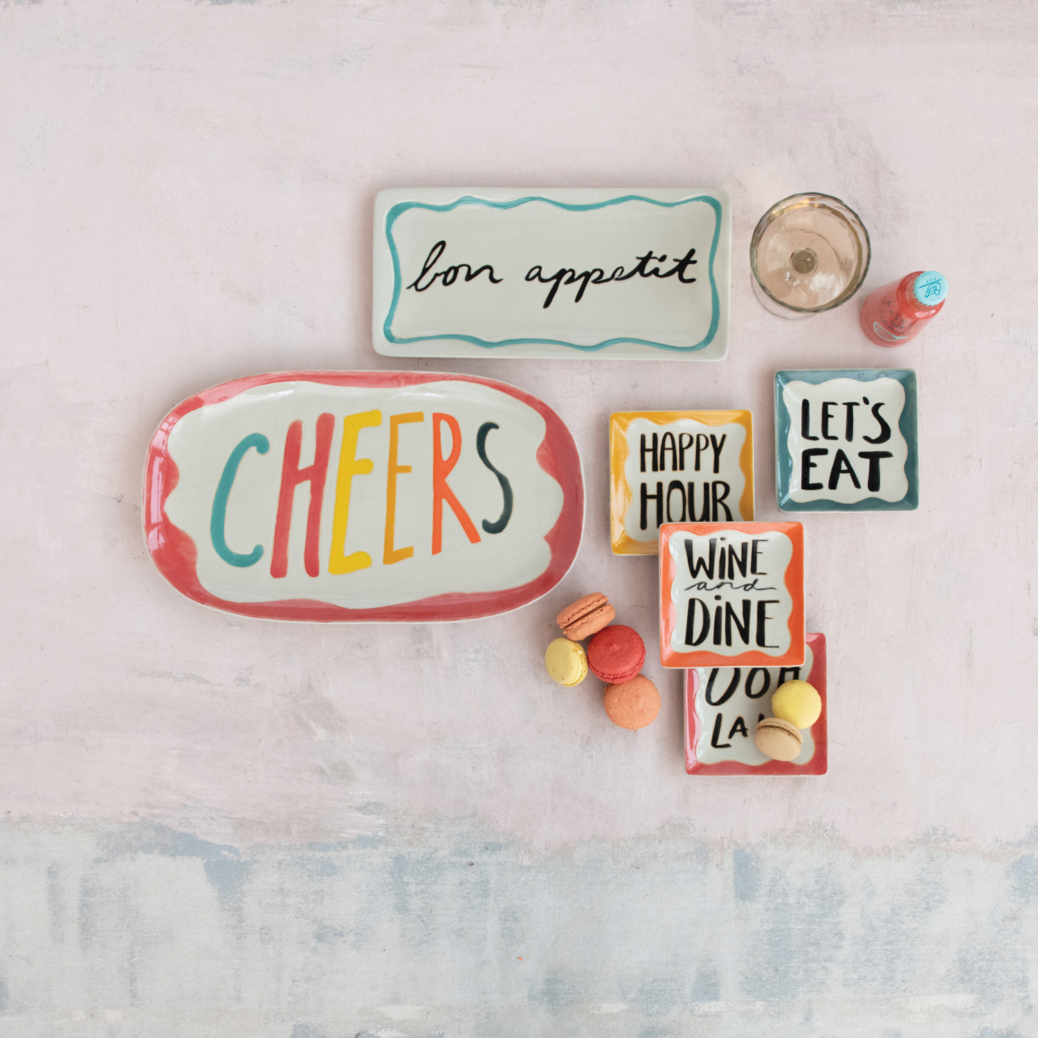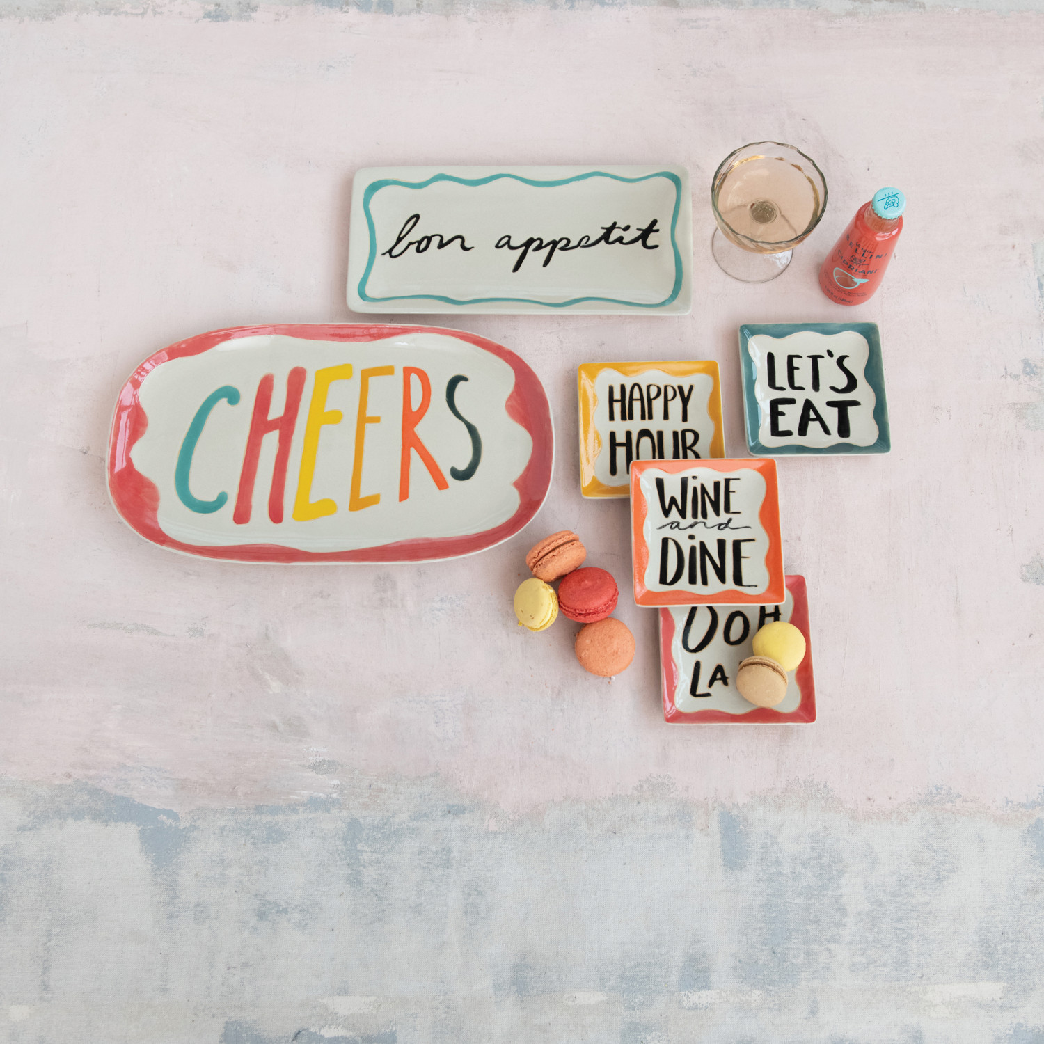 Catalog Name: 15-3/4"L x 10"W Stoneware Platter w/ Wax Relief Word "Cheers", Multi Color ©
