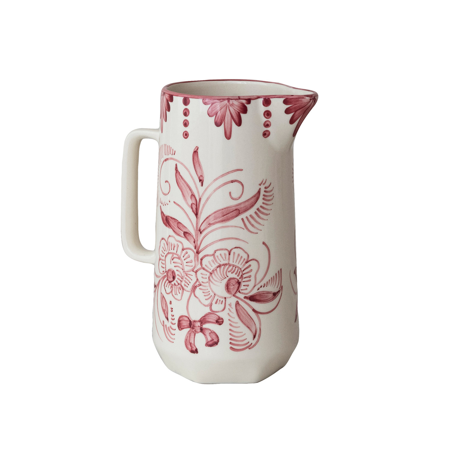 Catalog Name: 7-1/2"L x 5"W x 9-3/4"H 60 oz. Hand-Painted Stoneware Pitcher w/ Botanical Design, Burgundy & White (Each One Will Vary)