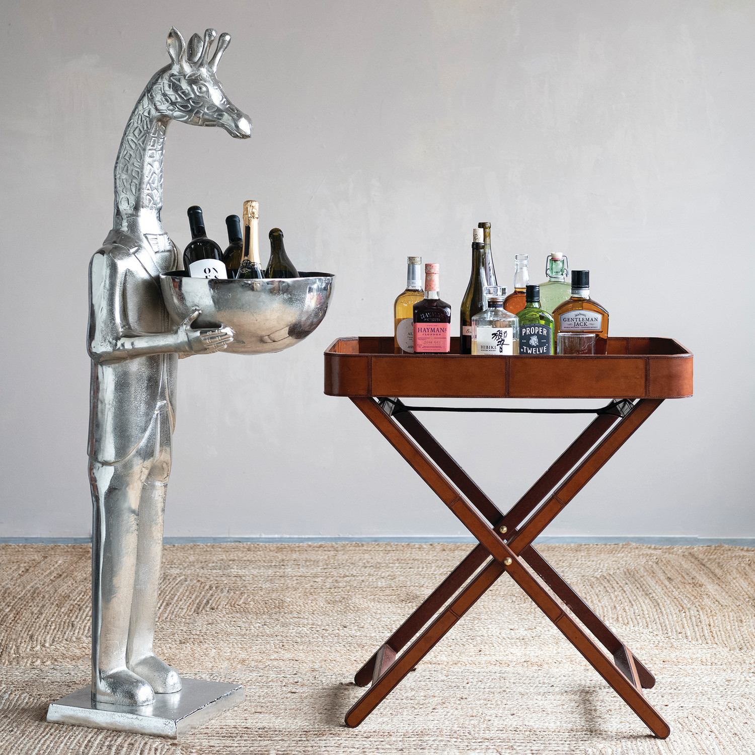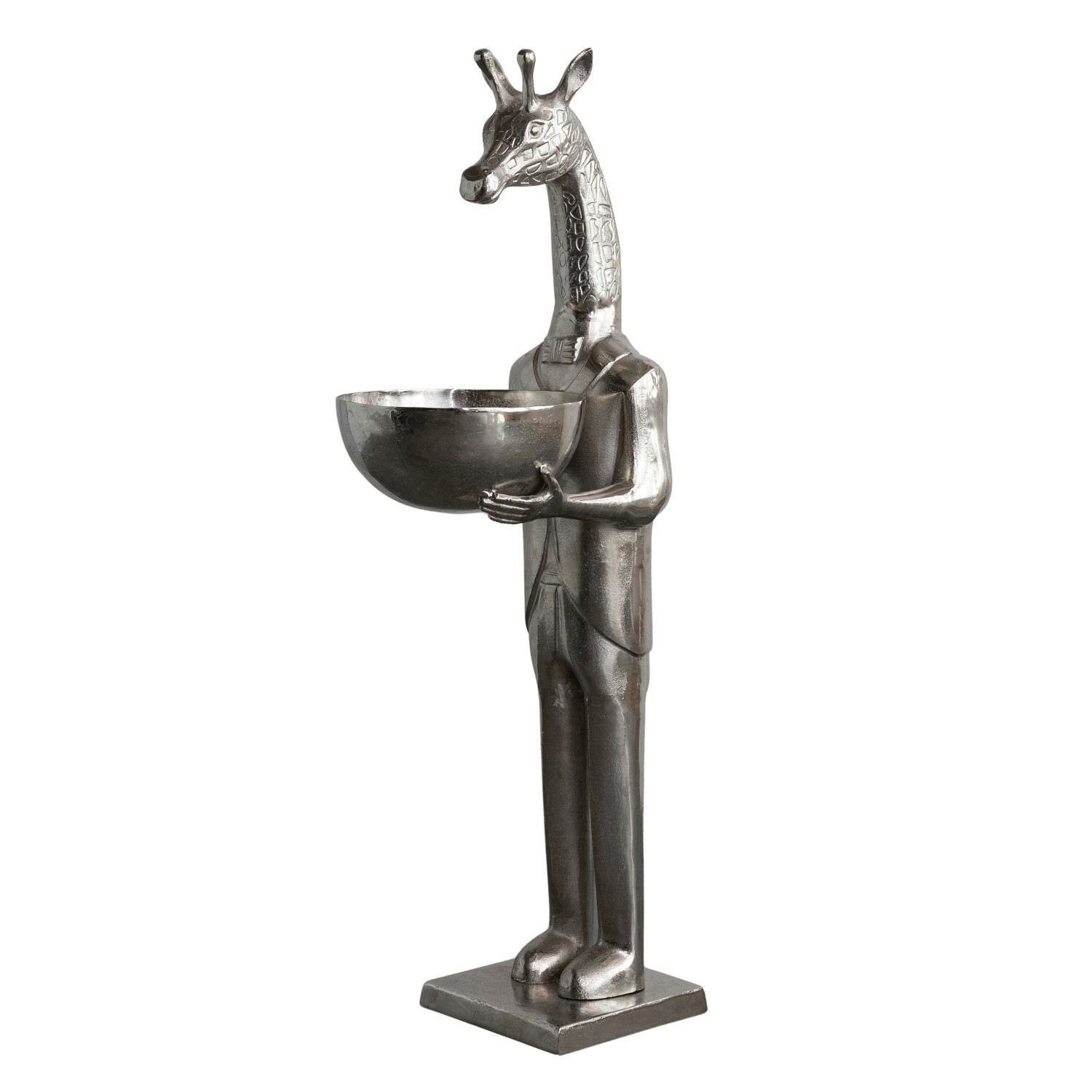 Catalog Name: 15"L x 23"W x 58"H Cast Aluminum Giraffe Butler Holding Bowl, Nickel Finish, Truck Ship