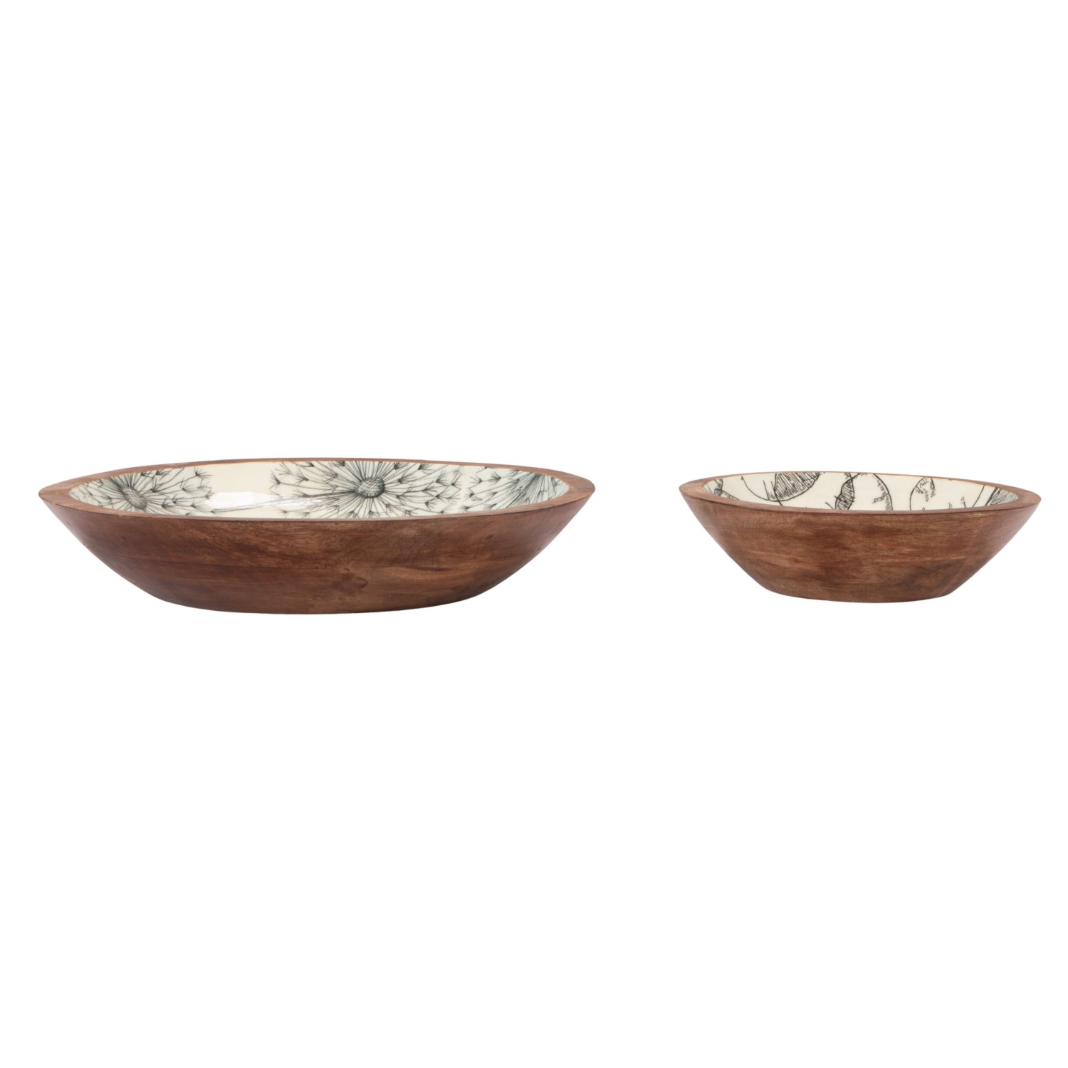 Enameled Mango Wood Bowls with Botanical Patterns, Cream Color & Grey, Set of 2
