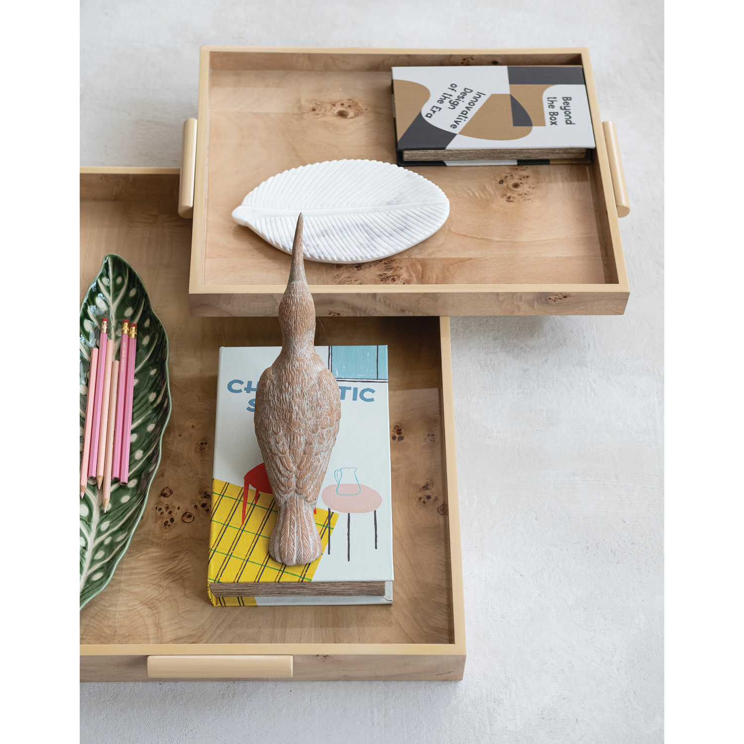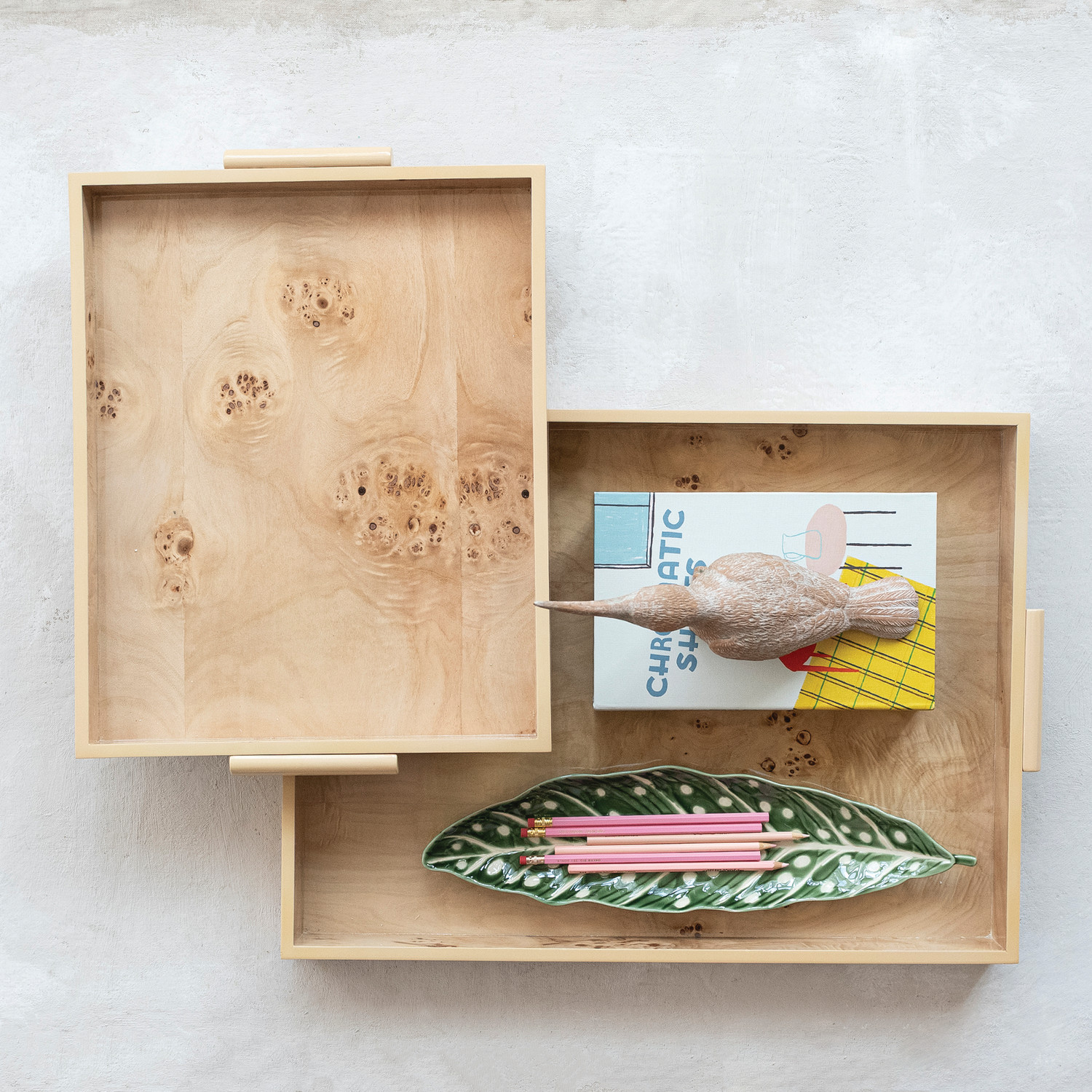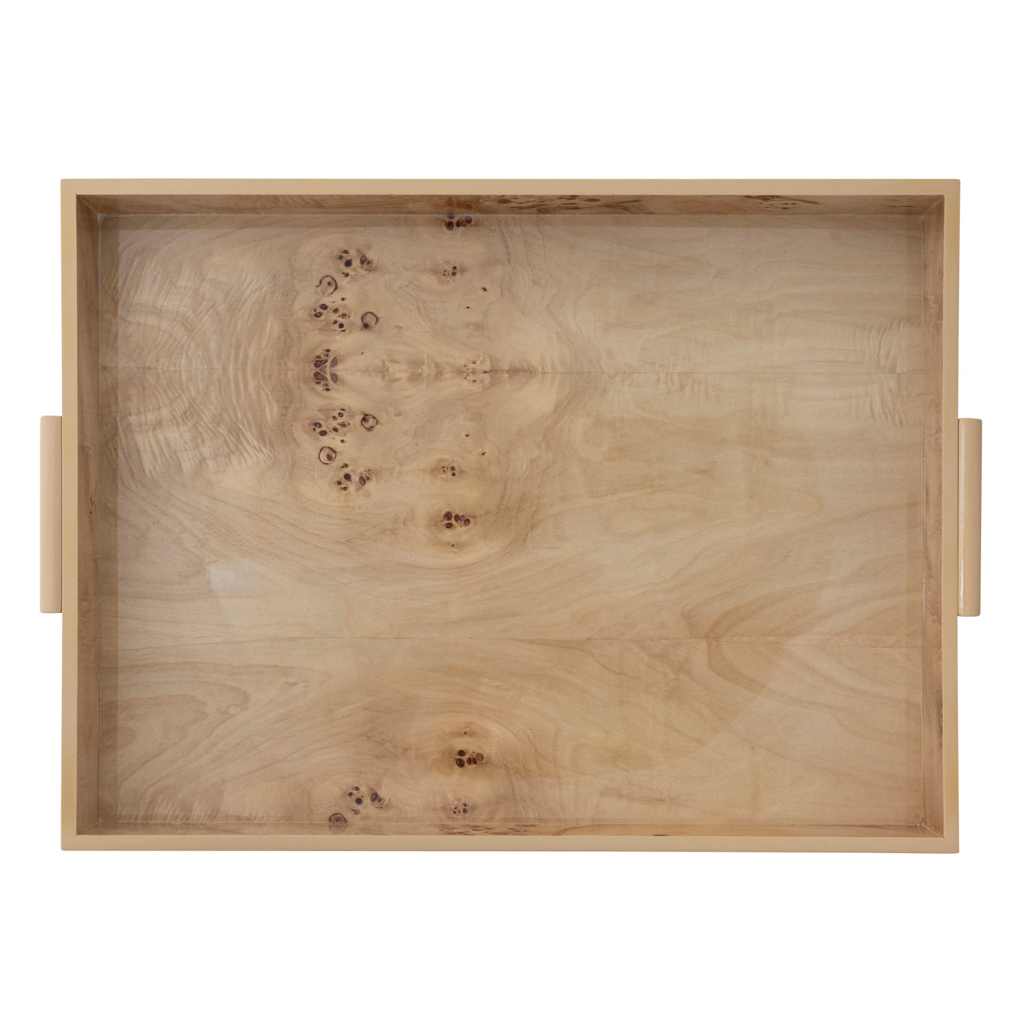 MDF & Burl Wood Veneer Trays with Handles, Natural, Set of 2