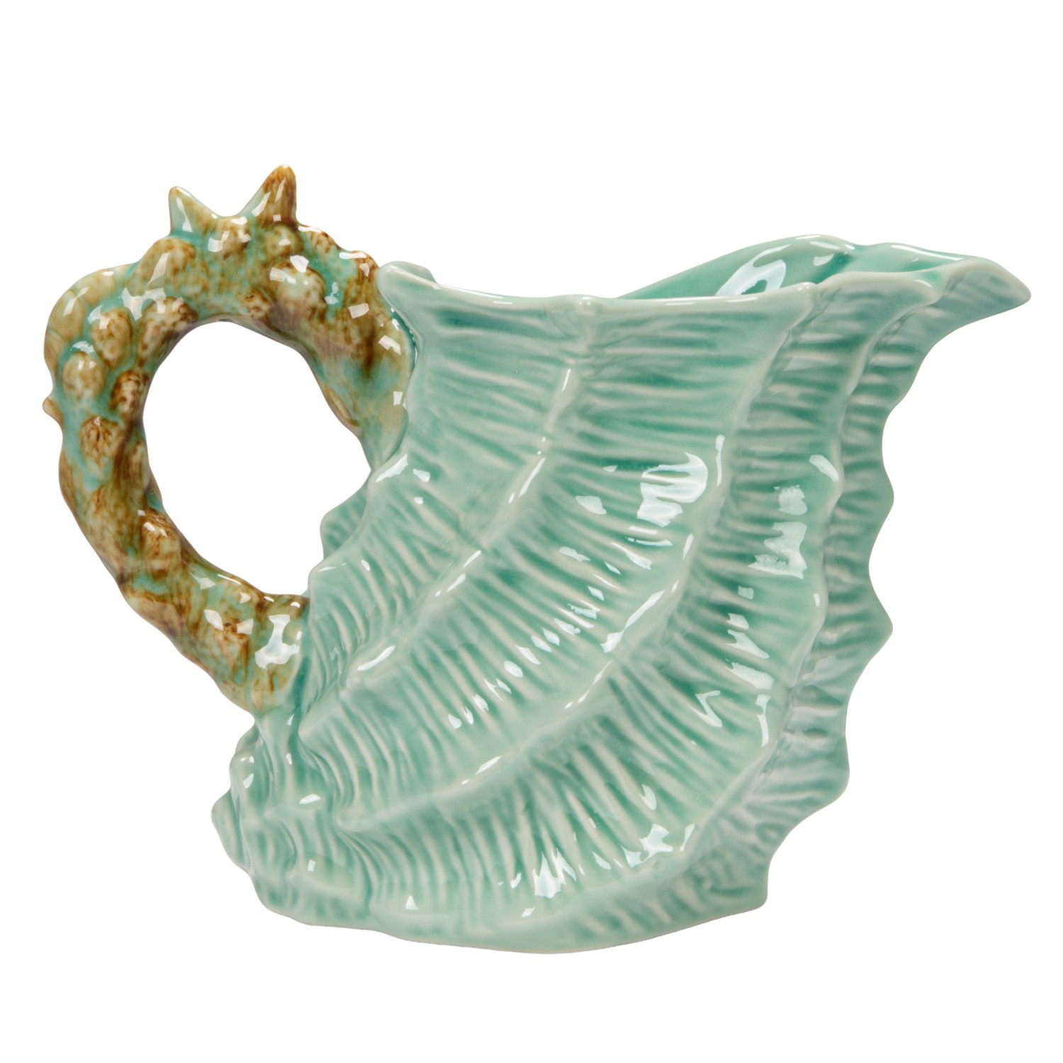 Catalog Name: 8-1/2"L x 5"W x 7"H 1 Quart Stoneware Shell Shaped Pitcher w/ Starfish & Shells Handle, Blue & Brown