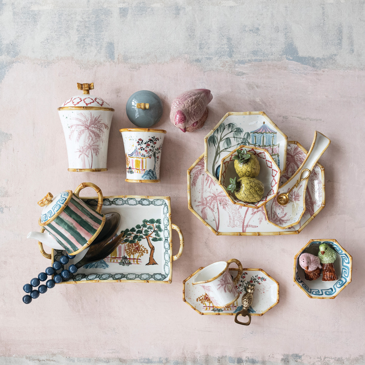 28 oz. Hand-Painted Stoneware Striped Teapot with Pattern & Bamboo Style Edges