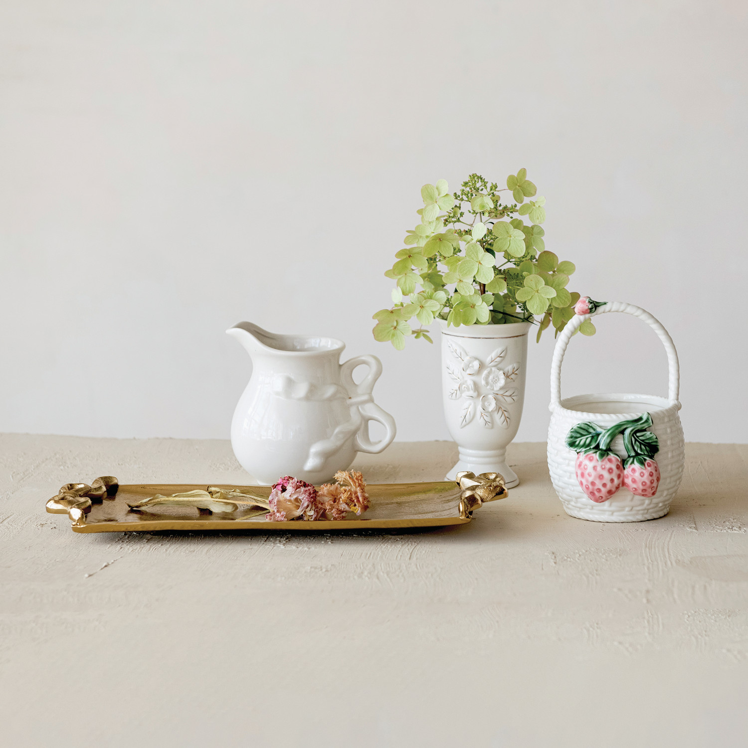 Catalog Name: 6"L x 5"W x 7-1/2"H Stoneware Basket Shaped Container w/ 3D Strawberries & Handle, White, Green & Pink