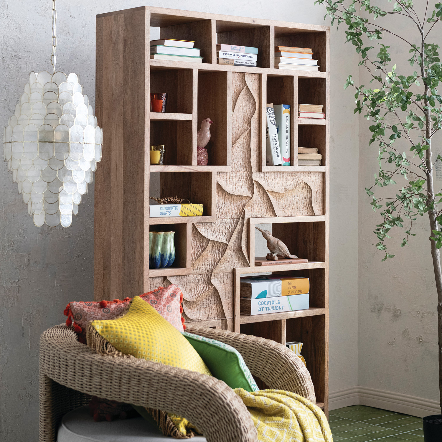 Catalog Name: 39"W x 14"D x 74"H Carved Mango Wood Two-Sided Shelf w/ 22 Compartments, Natural, Truck Ship (Sits Vertically or Horizontally)