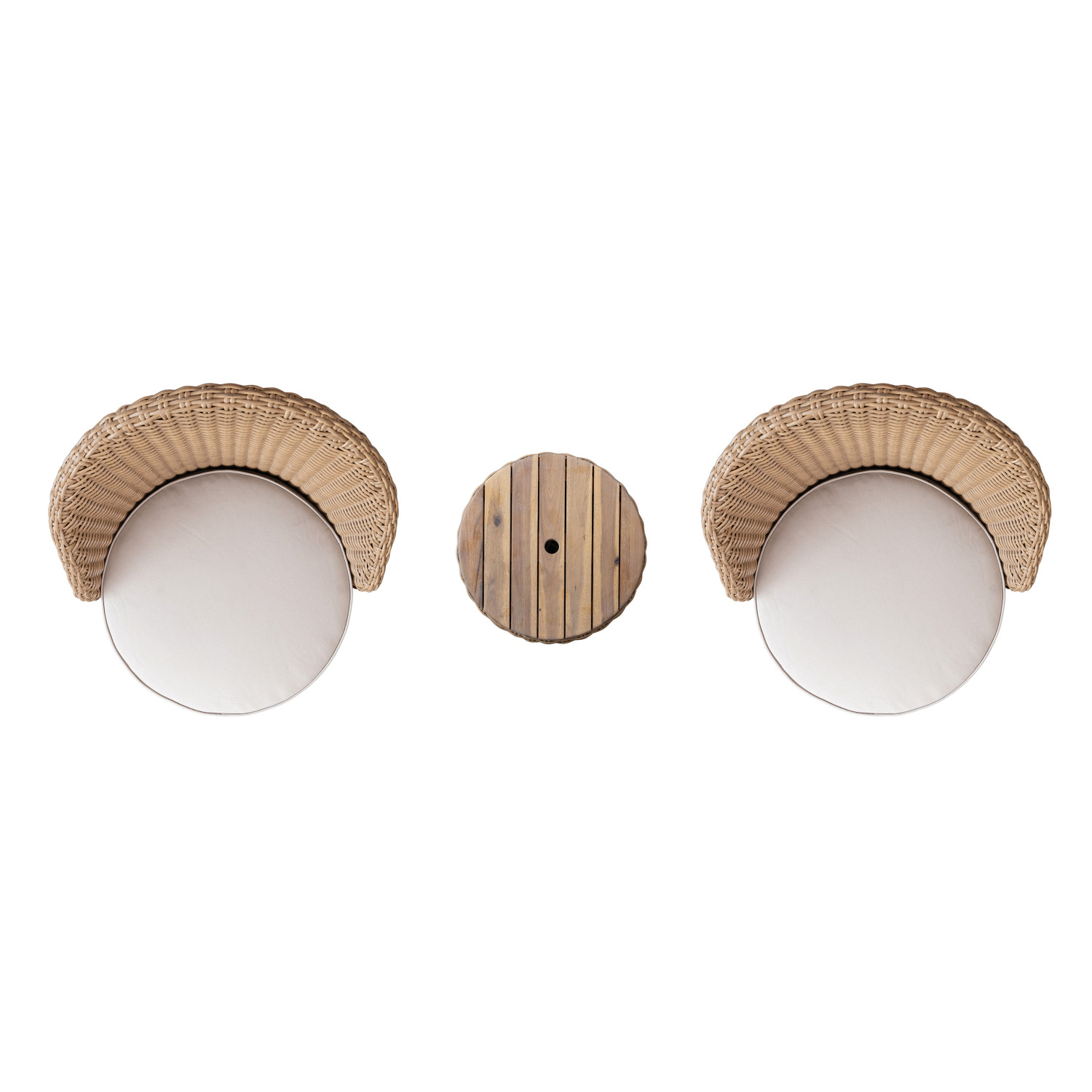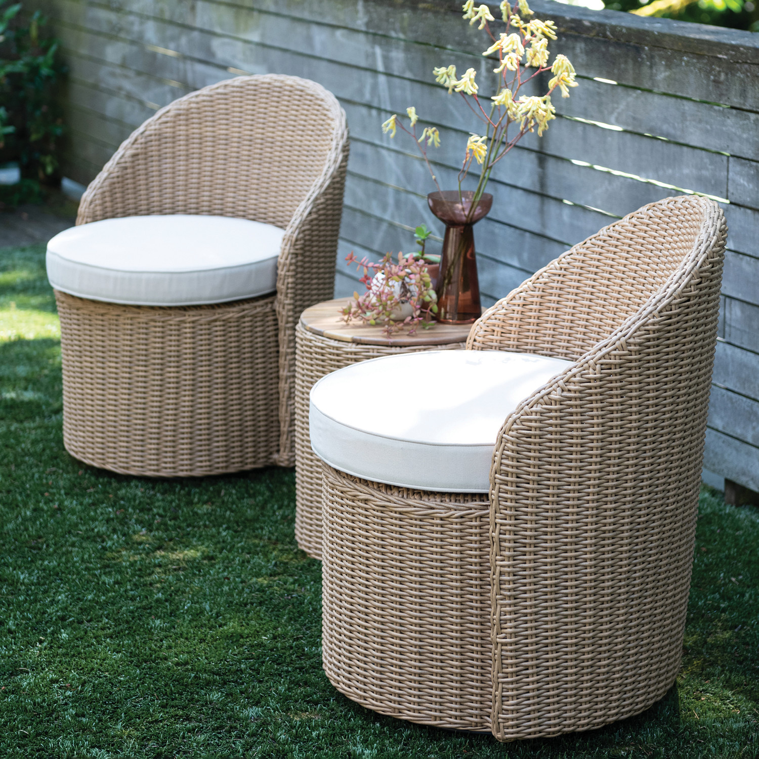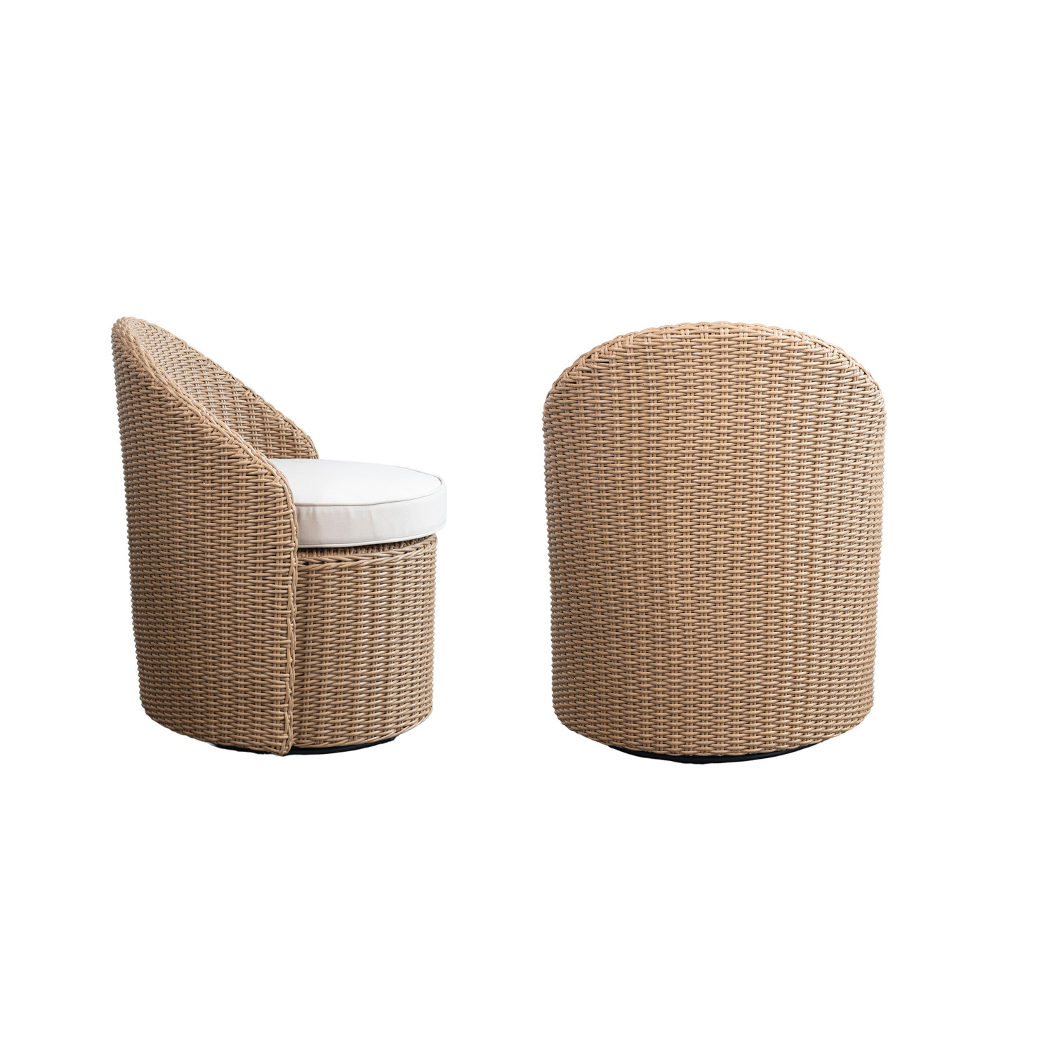 Catalog Name: (2) 25-3/4"W x 24"D x 32"H Plastic Wicker Indoor/Outdoor Swivel Chairs w/ Fabric Cushions & 15-3/4" Round x 18-1/2"H Storage Table w/ Acacia Wood Lid, Natural & Ivory Color, Set of 3, Truck Ship