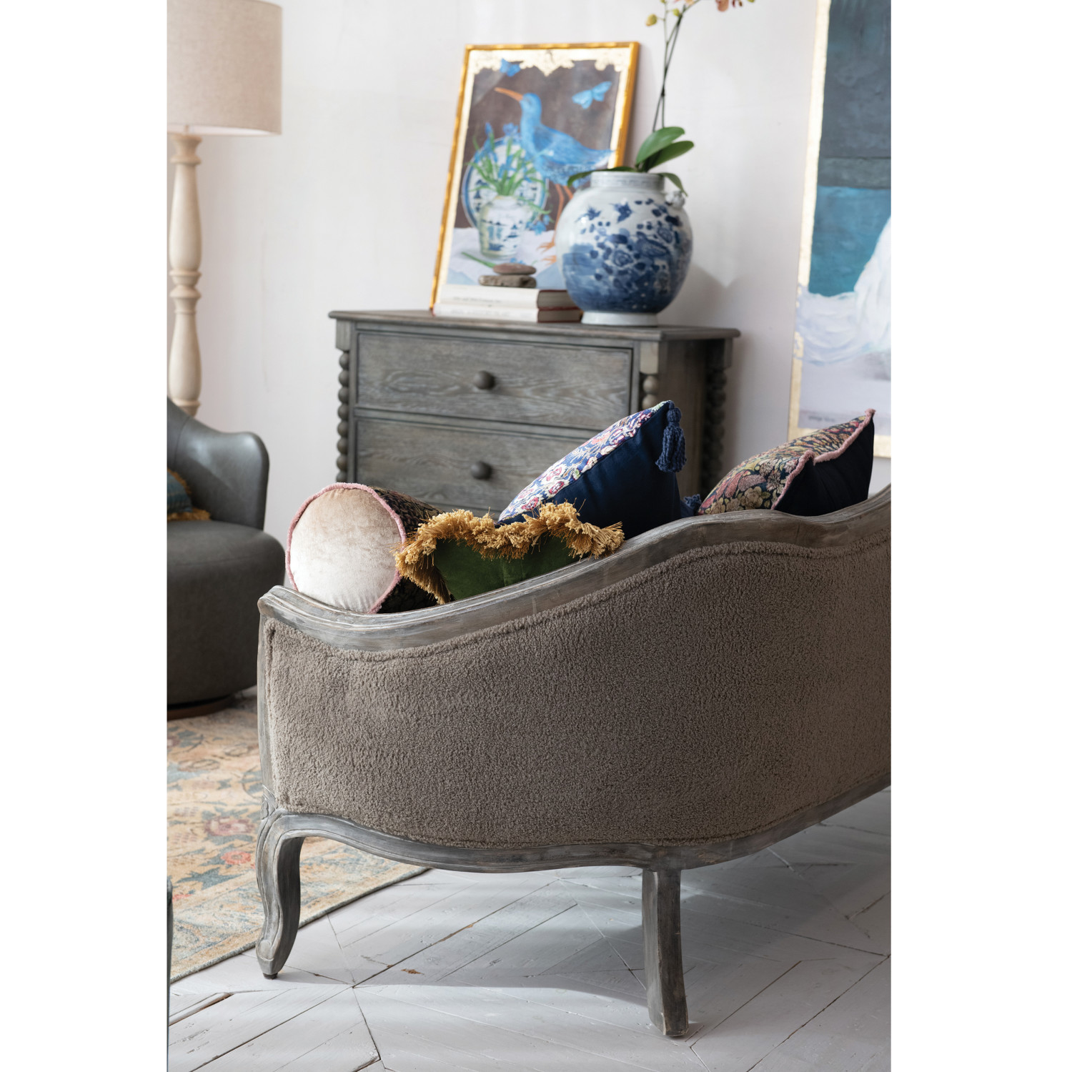 Catalog Name: 67"W x 28-1/2"D x 31"H Bouclé Fabric Upholstered Pintucked Sofa w/ Hand-Carved Mango Wood Frame, Brown & Antique Grey, Truck Ship