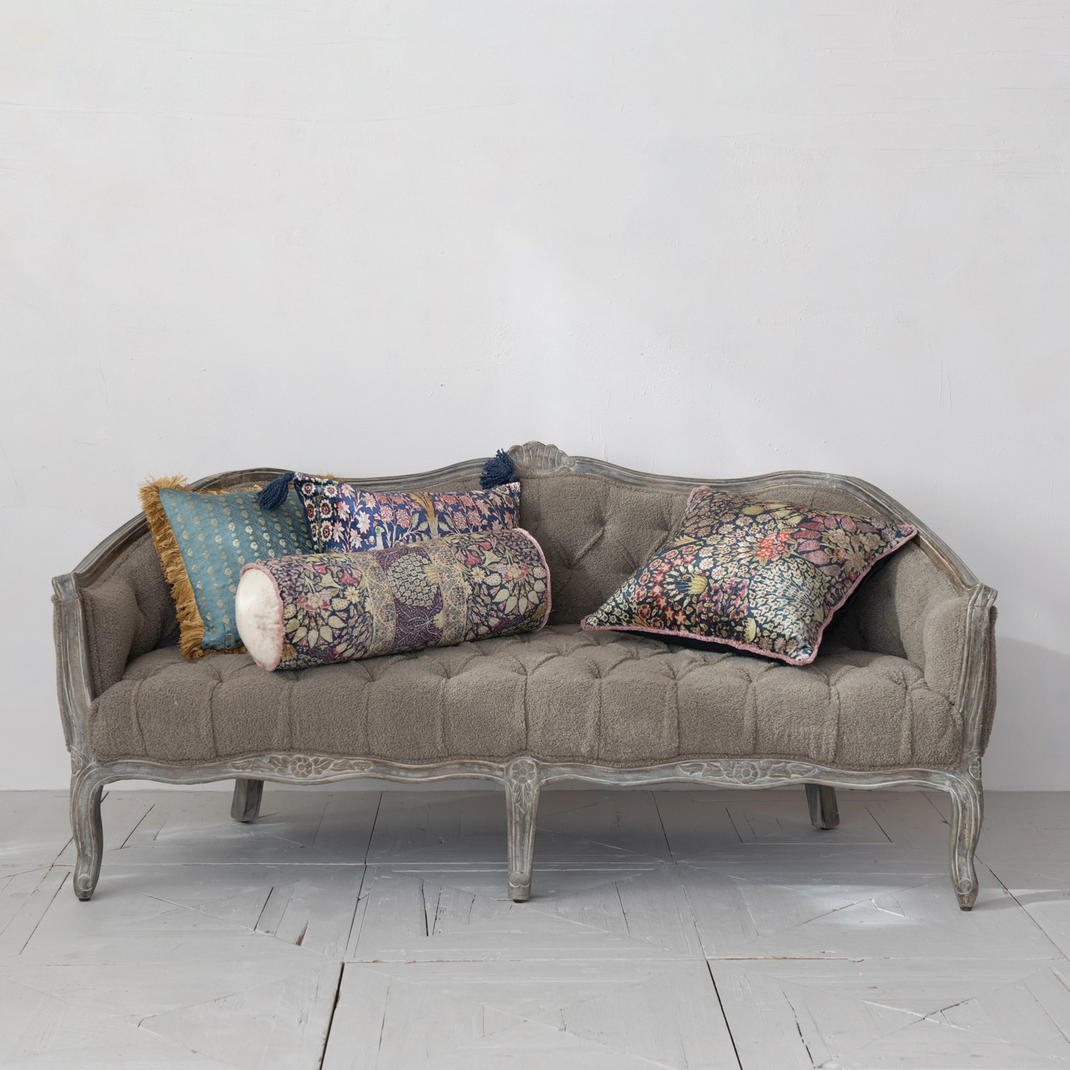 Bouclé Fabric Upholstered Pintucked Sofa w/ Hand-Carved Mango Wood Frame