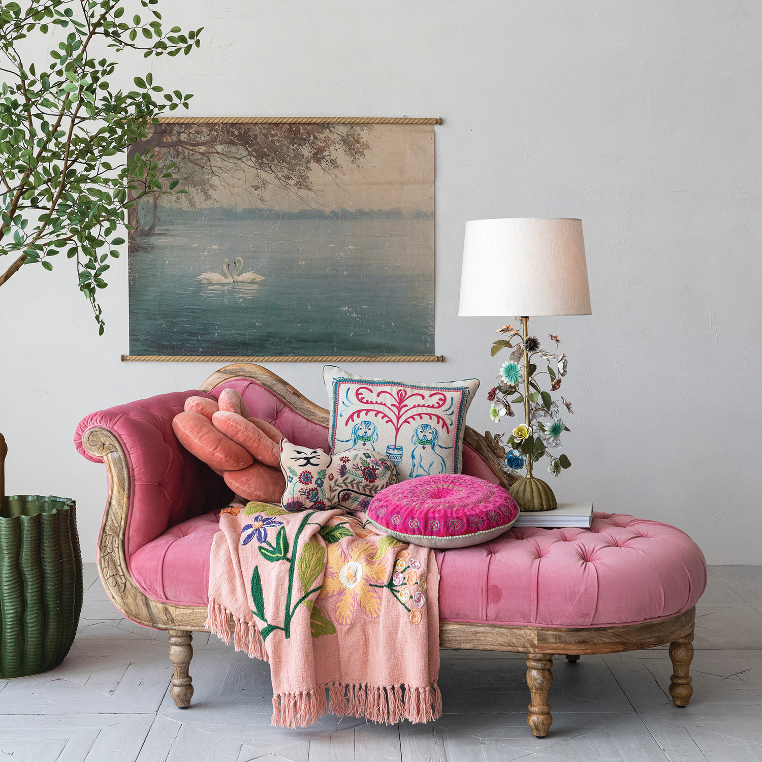 Velvet Upholstered Chaise Lounge with Carved Mango Wood Frame, Pink & Natural