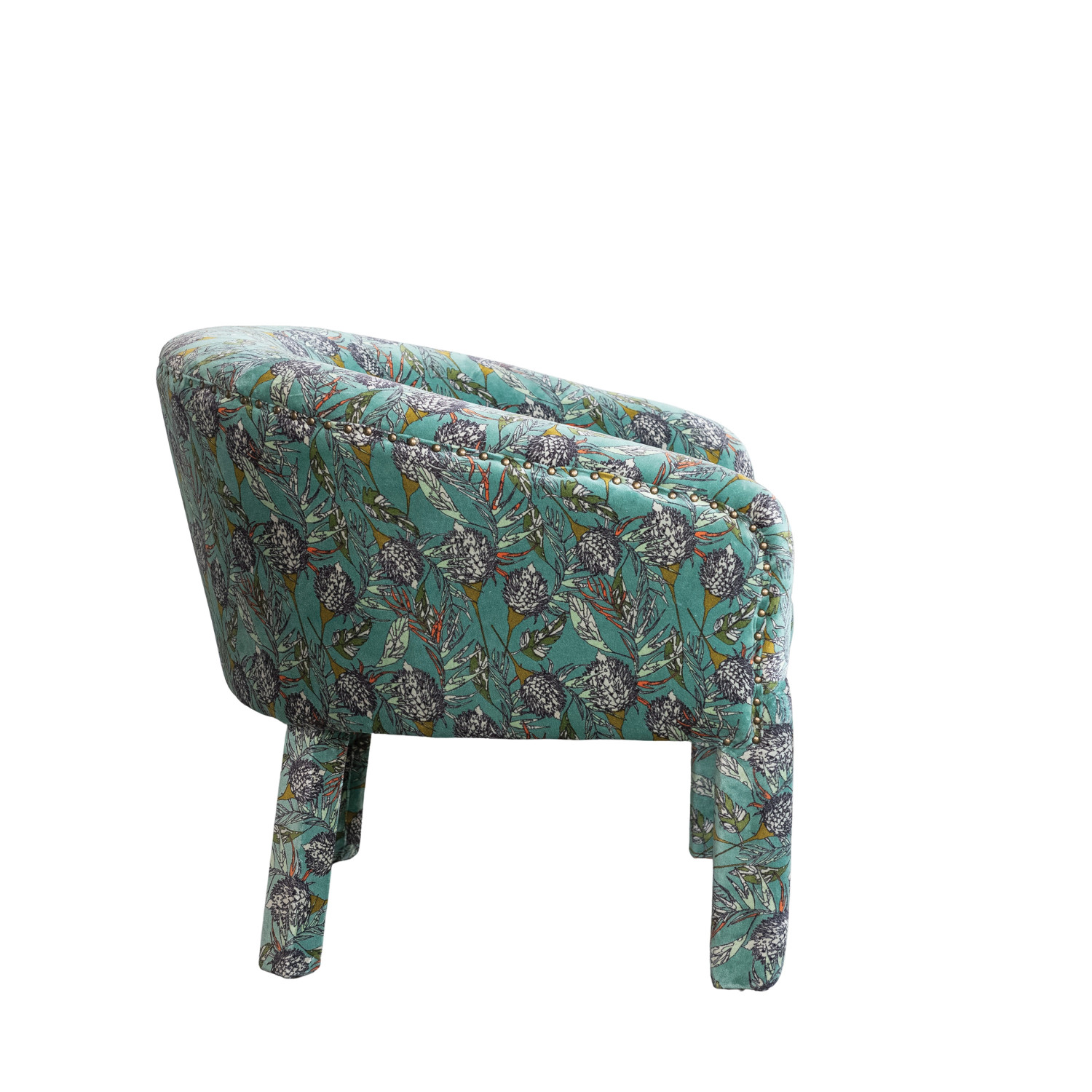 Cotton Velvet Upholstered Arm Chair with Botanical Pattern & Nail Heads