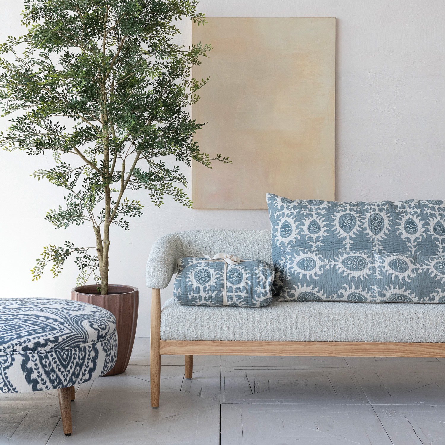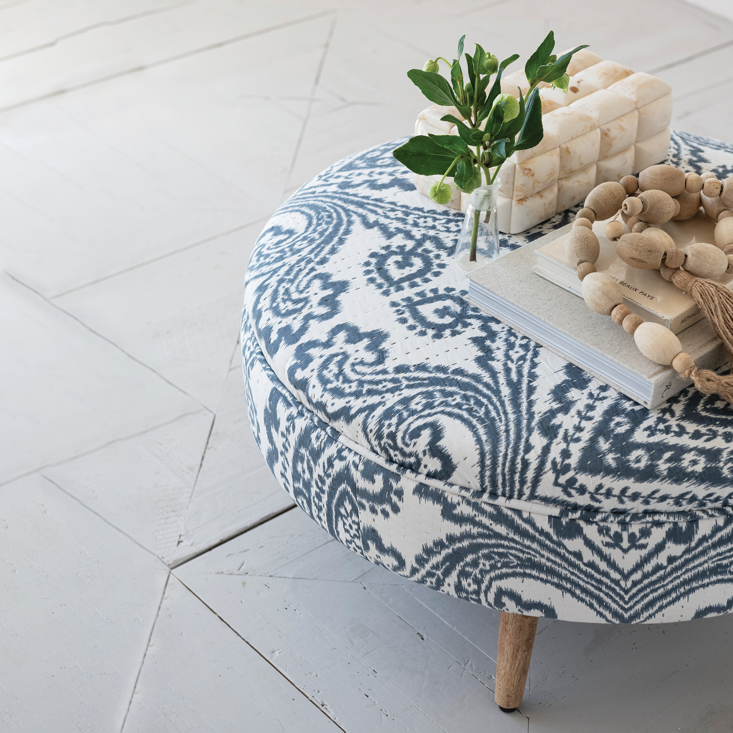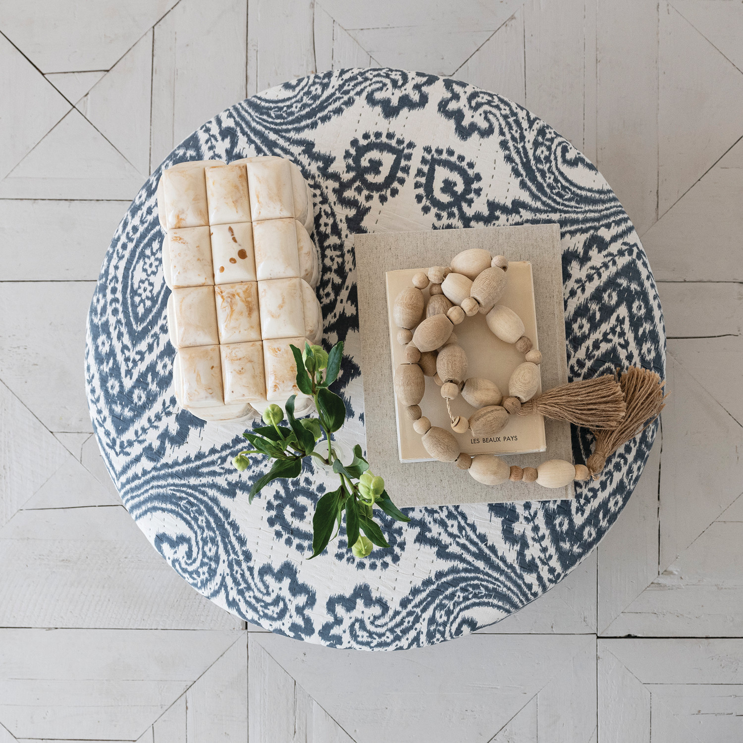 Catalog Name: 30" Round x 16"H Cotton Voile Upholstered Stool w/ Paisley Pattern, Hand-Embroidered Kantha Stitch & Mango Wood Legs, Blue, Cream Color & Natural
