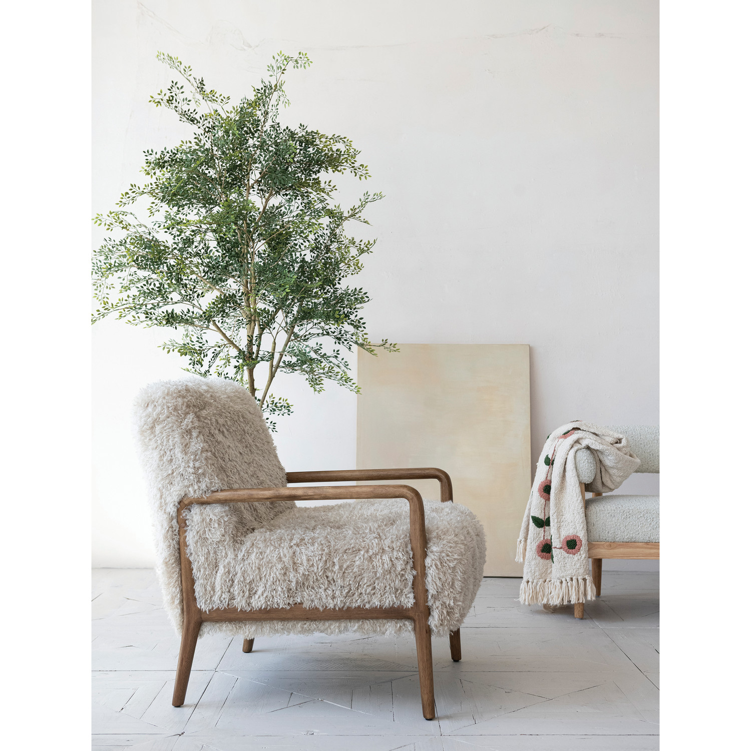 Catalog Name: 25-1/2"W x 29-3/4"D x 31-3/4"H Faux Fur Upholstered Chair w/ Rubberwood Frame, Cream Color & Walnut Finish, KD, Truck Ship