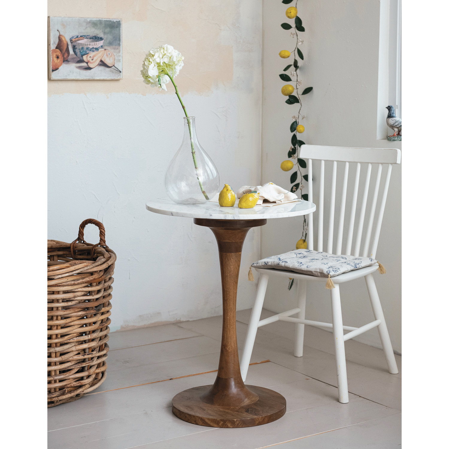 This Mango Wood and Marble Tulip Table stands as a testament to timeless design and natural beauty. The round table, measuring 23.75 inches in diameter and 29 inches in height, offers a spacious surface for various uses. The sturdy mango wood base, paired with the luxurious marble top, creates a harmonious blend of textures and colors that will complement any room. Whether it's anchoring a cozy nook in a farmhouse, adding sophistication to a modern living space, or making a statement in a French country setting, this table is as versatile as it is stunning. It's not just a piece of furniture; it's a centerpiece that brings life and character to the home.