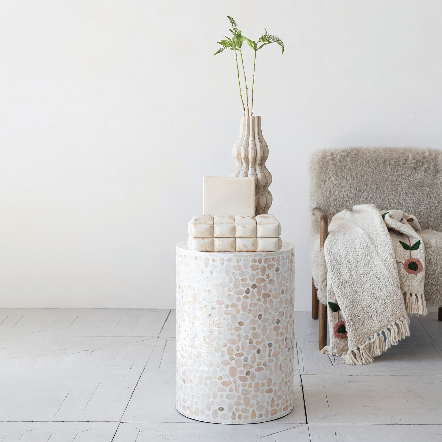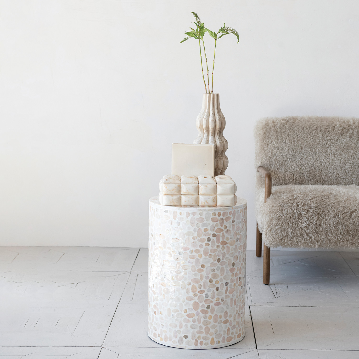 Catalog Name: 15-3/4" Round x 22"H MDF & Mother of Pearl Mosaic Table, White & Natural