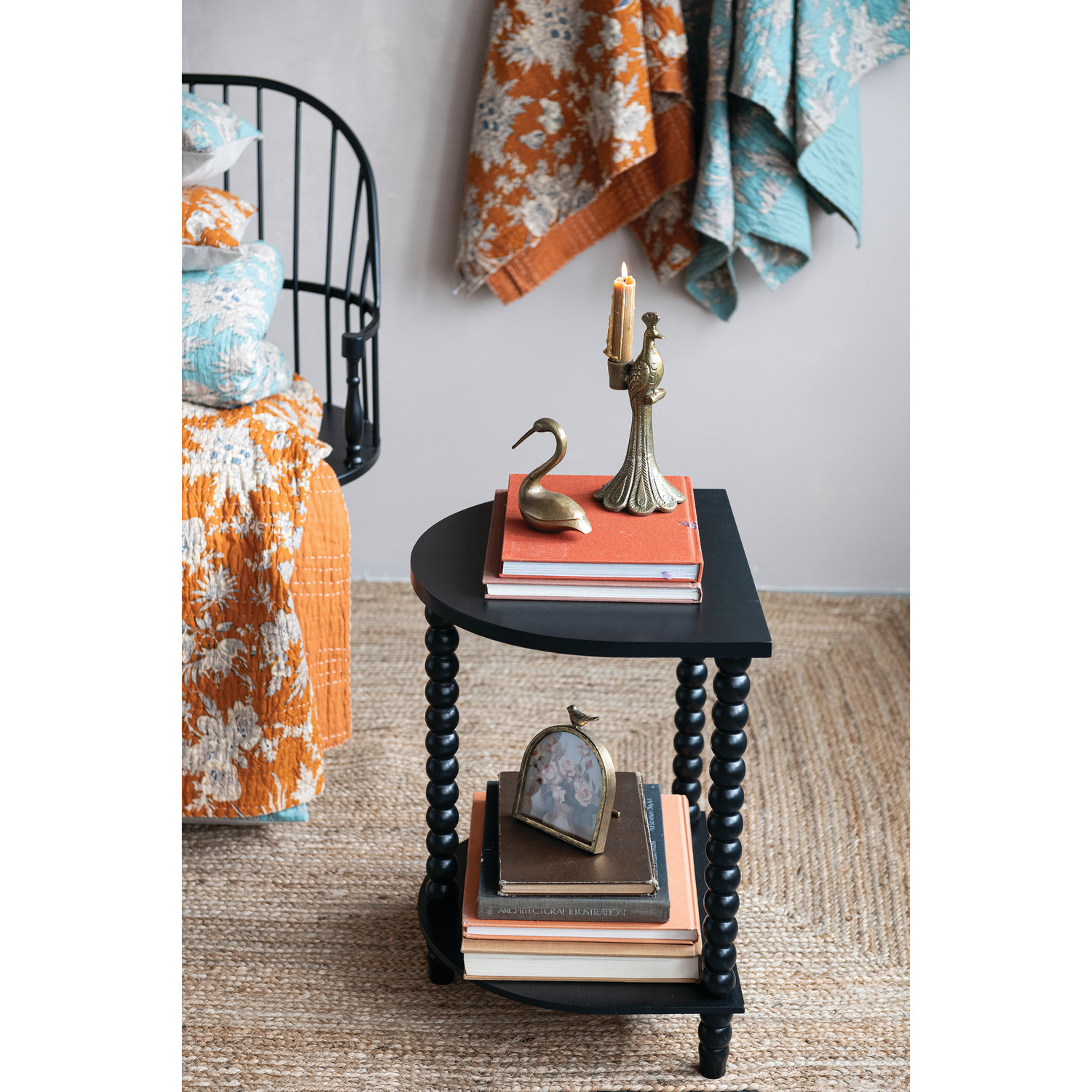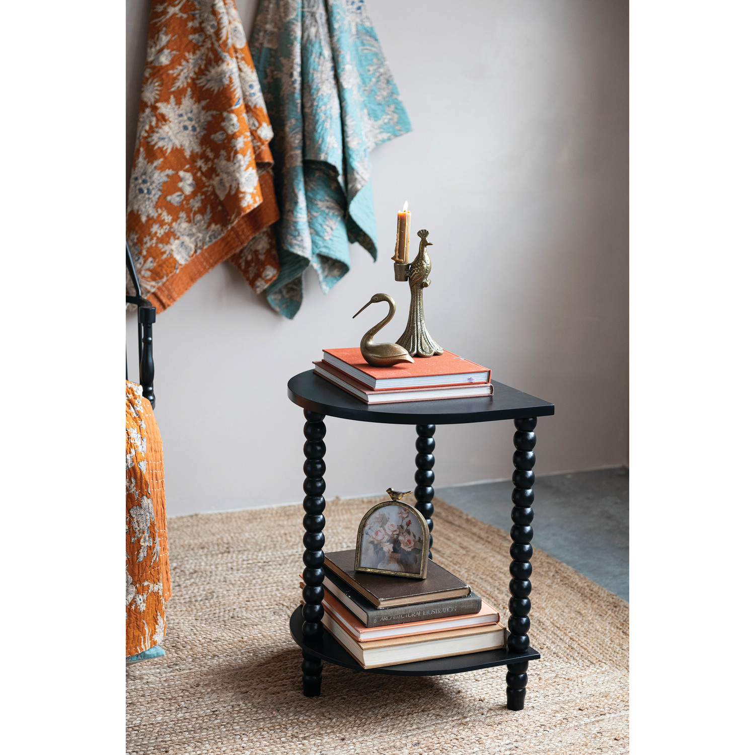MDF & Wood Demilune Table with Turned Legs & Shelf, Black, KD