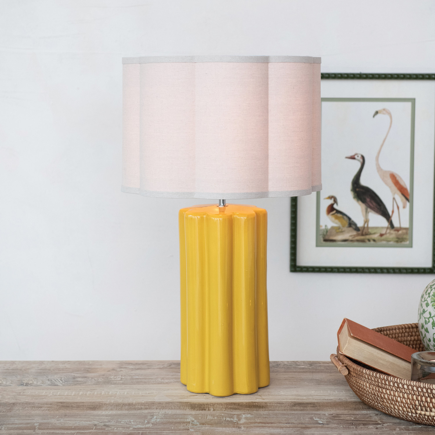 Stoneware Fluted Table Lamp w/ Scalloped Linen Shade & Swivel Neck, Mustard Color