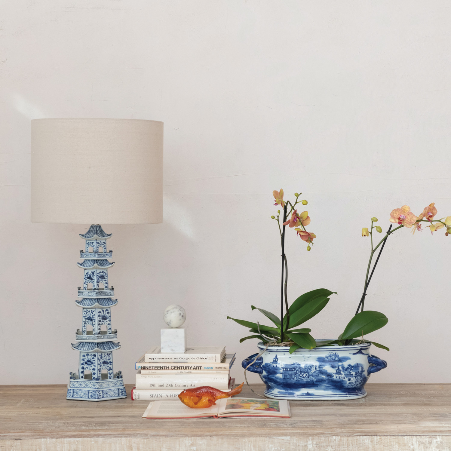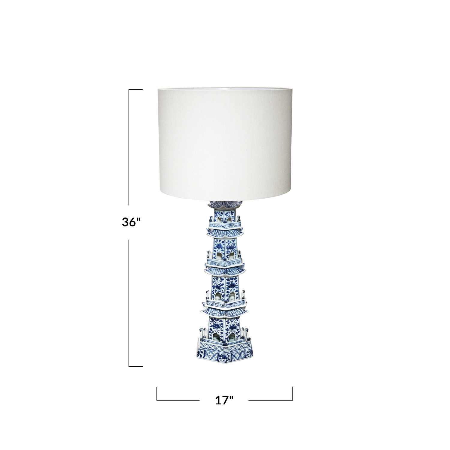 Catalog Name: 17" Round x 36"H Hand-Painted Stoneware Pagoda Shaped Table Lamp w/ Design, Linen Shade & Inline Switch, Blue & White, Truck Ship