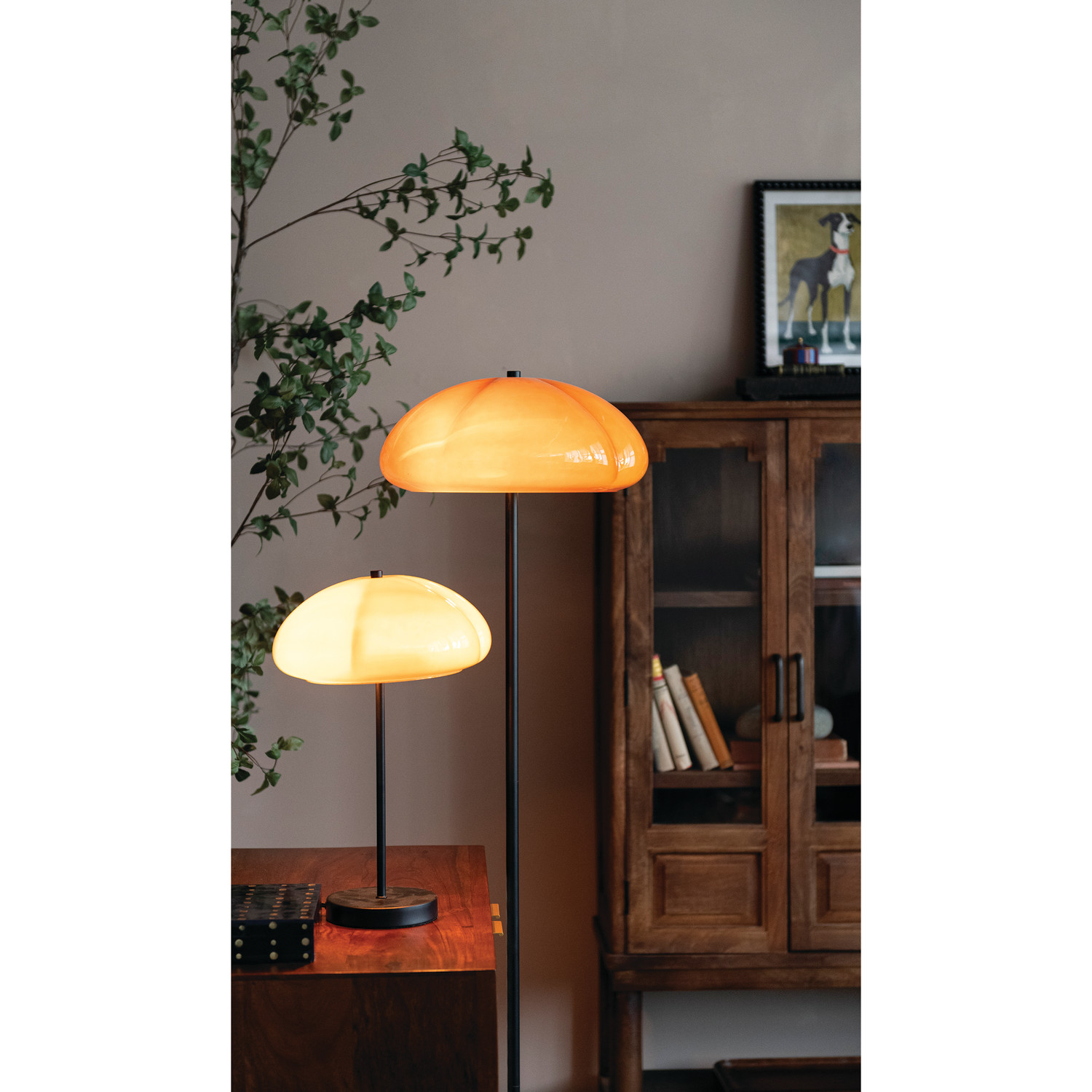 Catalog Name: 15-3/4" Round x 61-3/4"H Metal Floor Lamp w/ Opaque Glass Shade & Inline Switch, Black & Amber Color
