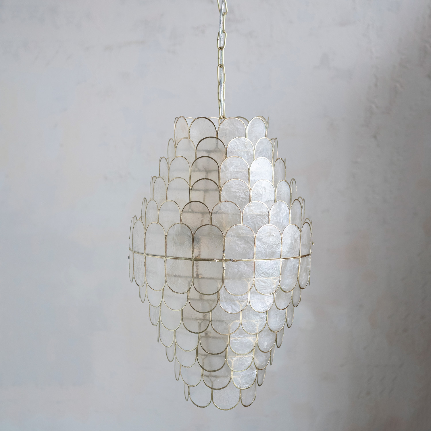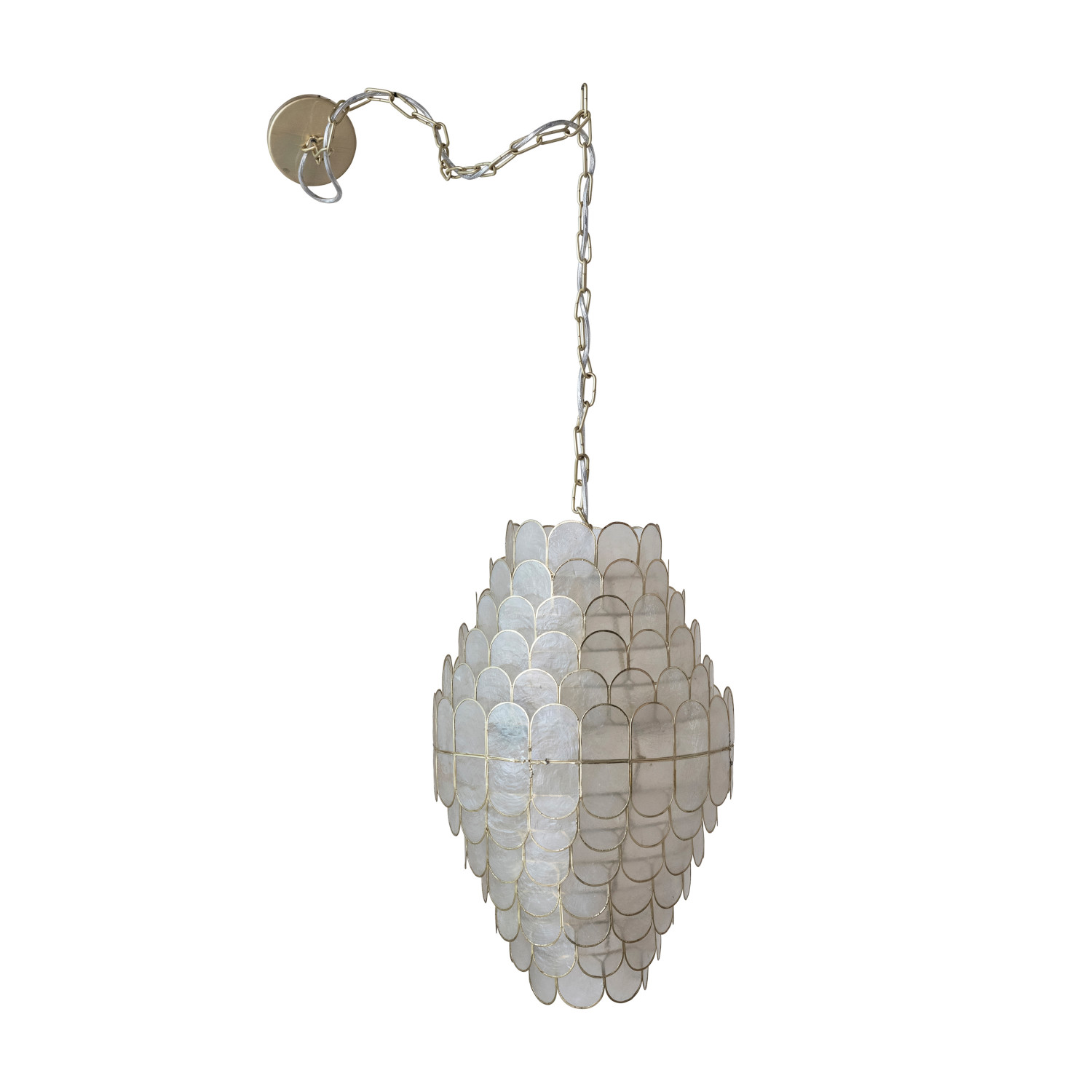 Catalog Name: 14" Round x 23"H Capiz Pendant Lamp, 2 Lights, 4' Chain & 5' Cord, Natural & Gold Finish (Hardwire Only)