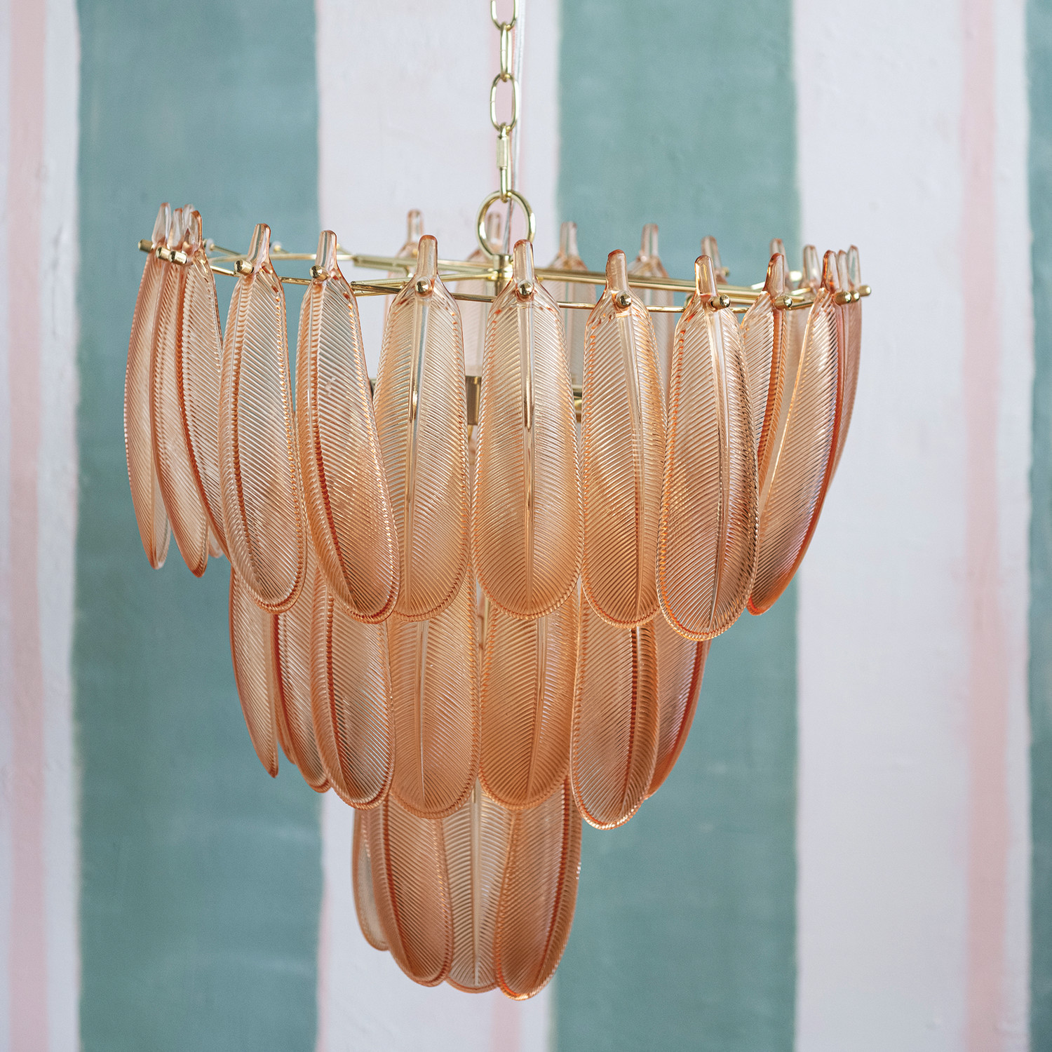 Catalog Name: 21" Round x 19-1/2"H Metal & Hanging Feather Shaped Glass Chandelier, 7 Lights, 6' Chain & 10' Cord, Gold Finish & Blush Color, KD (Hardwire Only)