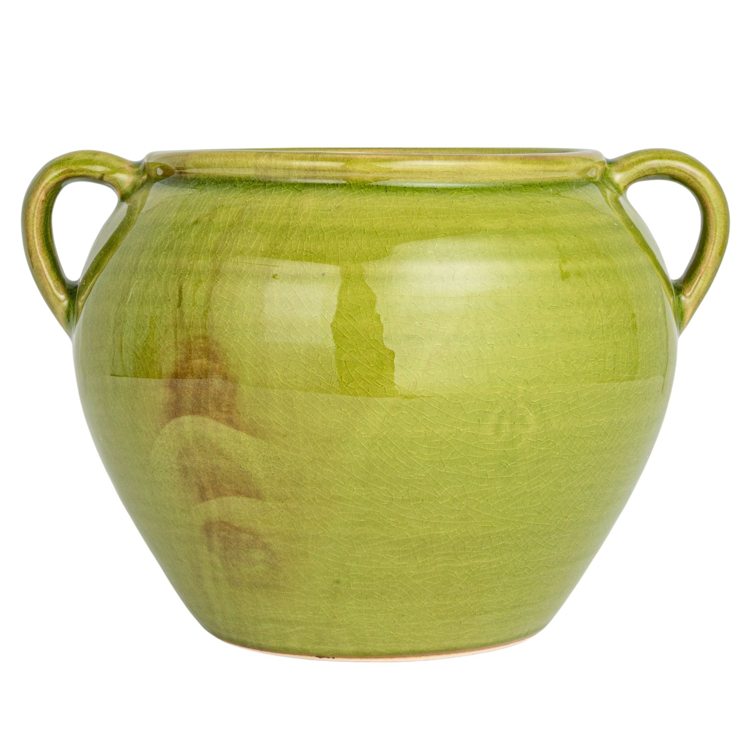 This Hand-Painted Terra-cotta Urn with Handles is a testament to the timeless beauty of artisan pottery. The reactive glaze finish in green ensures that no two urns are exactly alike, each one varying subtly in hue and pattern. Its round shape and convenient handles make it both a functional and decorative item, suitable for a variety of interior styles. Measures 10.75 inches in length, 9.25 inches in width, and 7.75 inches in height, a substantial piece that draws the eye. Whether displayed on a mantelpiece, used as a centerpiece, or placed on a side table, this urn adds a touch of elegance and a splash of color to any setting.