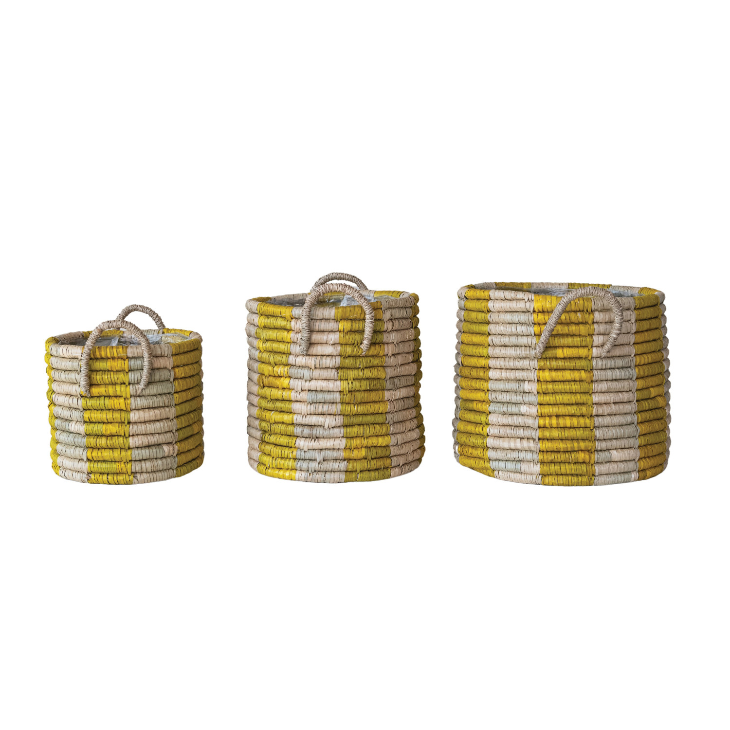 Catalog Name: 13" Round x 12"H, 11" Round x 11"H & 9" Round x 8-1/2"H Hand-Woven Seagrass Striped Baskets w/ Handles & Plastic Liners, Natural & Yellow, Set of 3