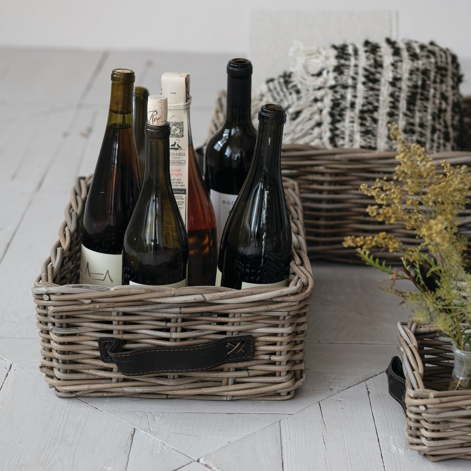 Catalog Name: 20"L x 15-3/4"W x 7"H, 17"L x 12-1/2"W x 6"H, 14"L x 10-1/4"W x 4-3/4"H & 11-1/2"L x 8-1/4"W x 3-1/2"H Hand-Woven Rattan Nesting Baskets w/ Leather Handles, Grey Washed, Set of 4