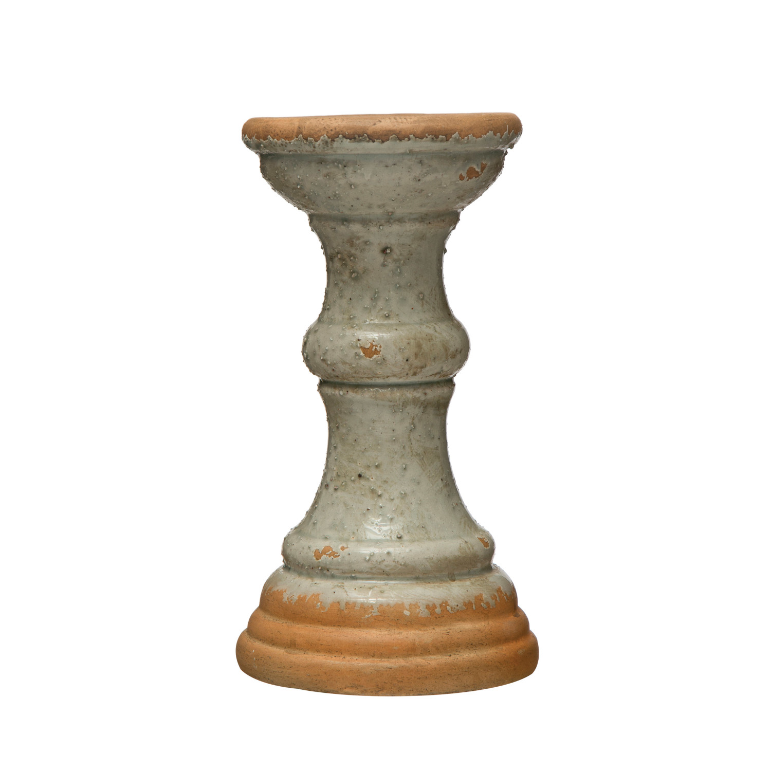 Catalog Name: 4-3/4" Round x 9-1/4"H Terra-cotta Candle Holder, Heavily Distressed Finish, Mint Color (Holds 3" Pillar)