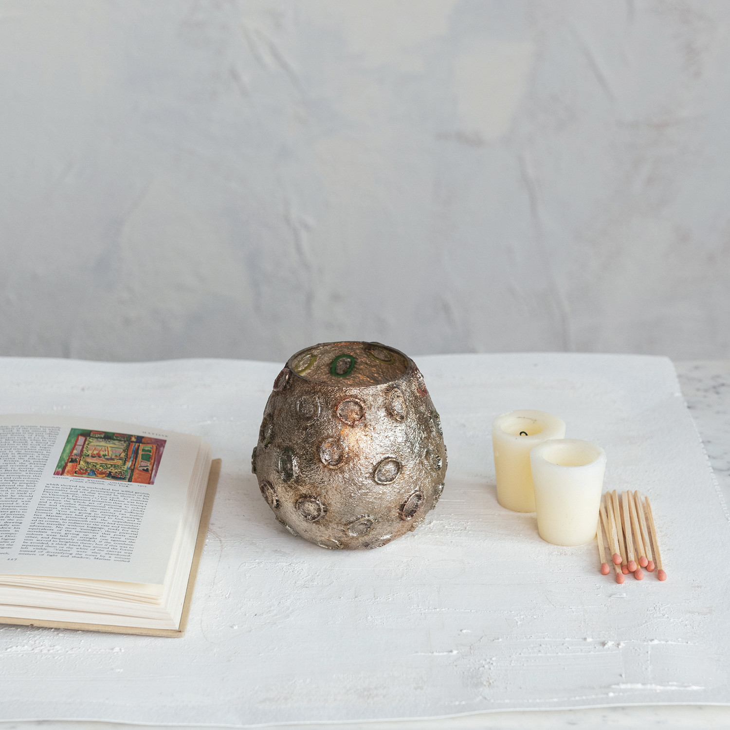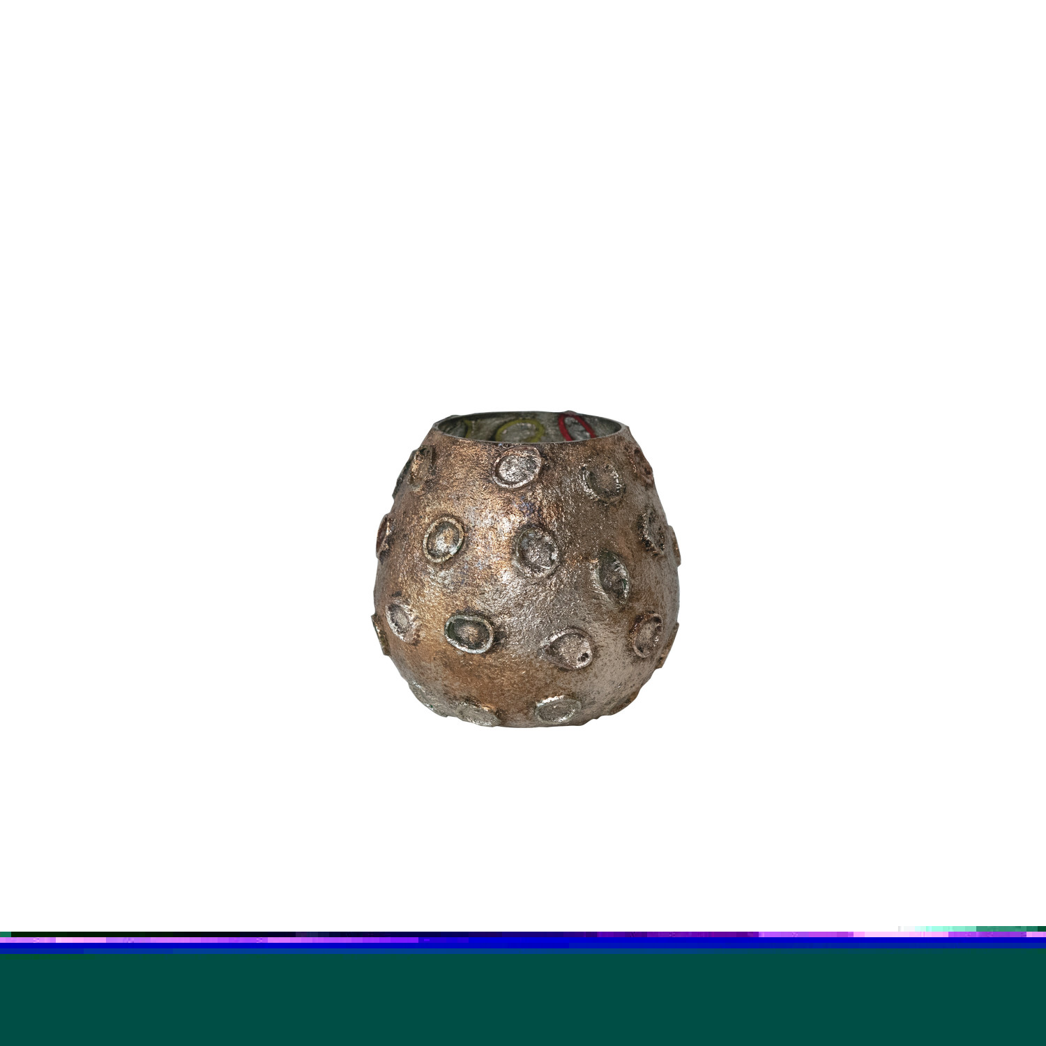 Catalog Name: 4" Round x 4"H Glass Tealight/Votive Holder w/ Embossed Rubber Band Circles, Metallic Finish