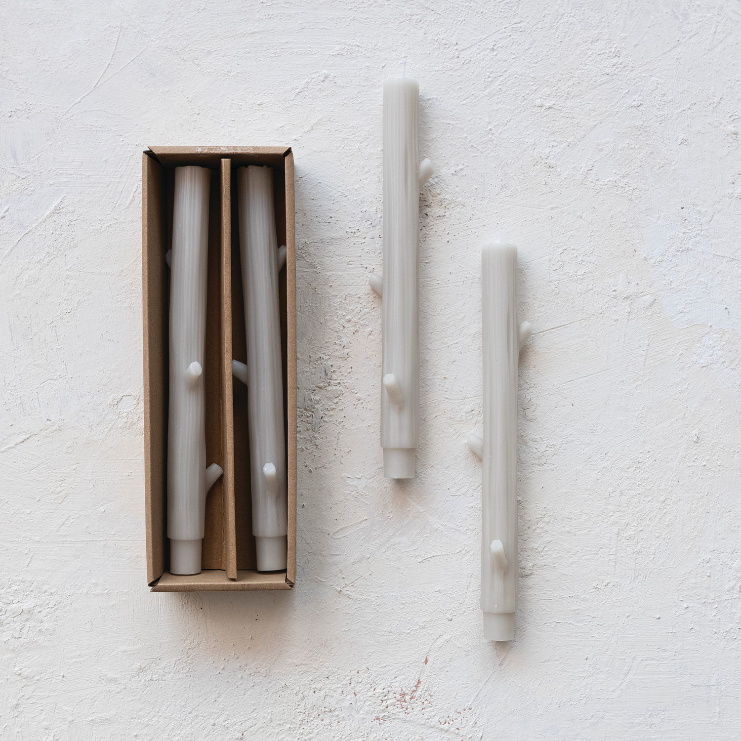 Catalog Name: 3-1/4"L x 1-3/4"W x 10-1/4"H Unscented Twig Shaped Taper Candles in Box, Grey, Set of 2 (Approximate Burn Time 8 Hours)