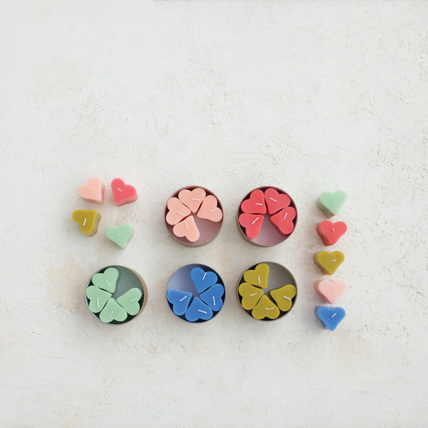 Catalog Name: 2"L x 2"W x 2-1/4"H Unscented Heart Shaped Candles in Box, Set of 5, 5 Colors (Est. Burn Time 4 Hours)