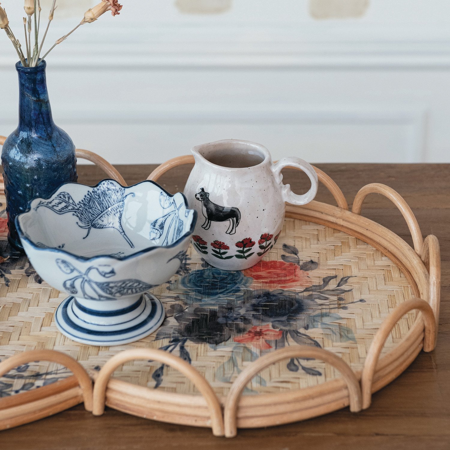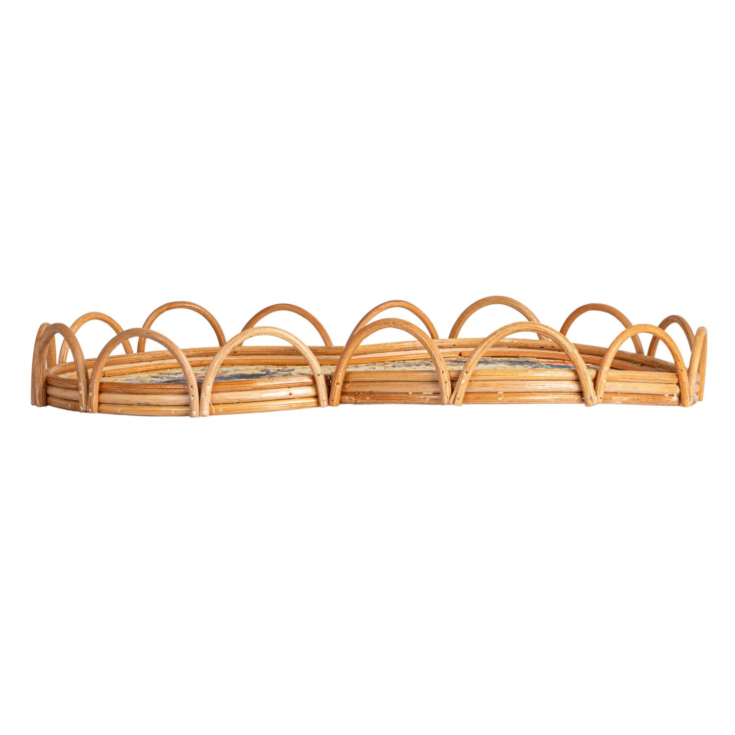 This Decorative Rattan and Bamboo Scalloped Tray is a true celebration of craftsmanship and design. With its generous size of 23.25 inches long and 15 inches wide, it's perfect for serving guests or displaying favorite items. The multi-colored floral patterns bring a burst of life to any room, while the natural materials of bamboo and rattan offer a sustainable and stylish option for the home. The tray's oval shape and scalloped edges provide an elegant touch, making it a versatile piece that complements boho, modern, or Southwestern decor. Whether used for practical purposes or as a statement piece, this tray is sure to captivate and delight.