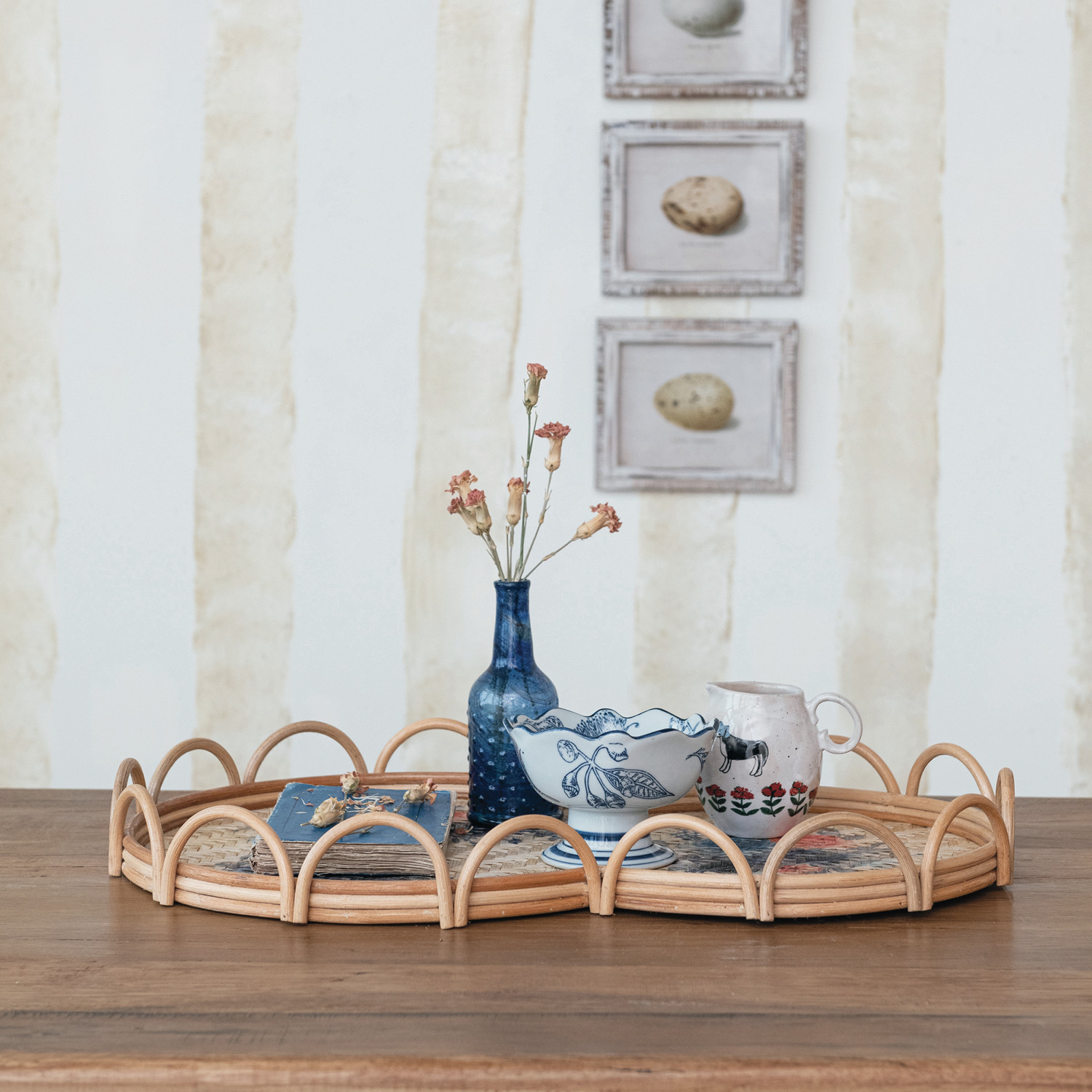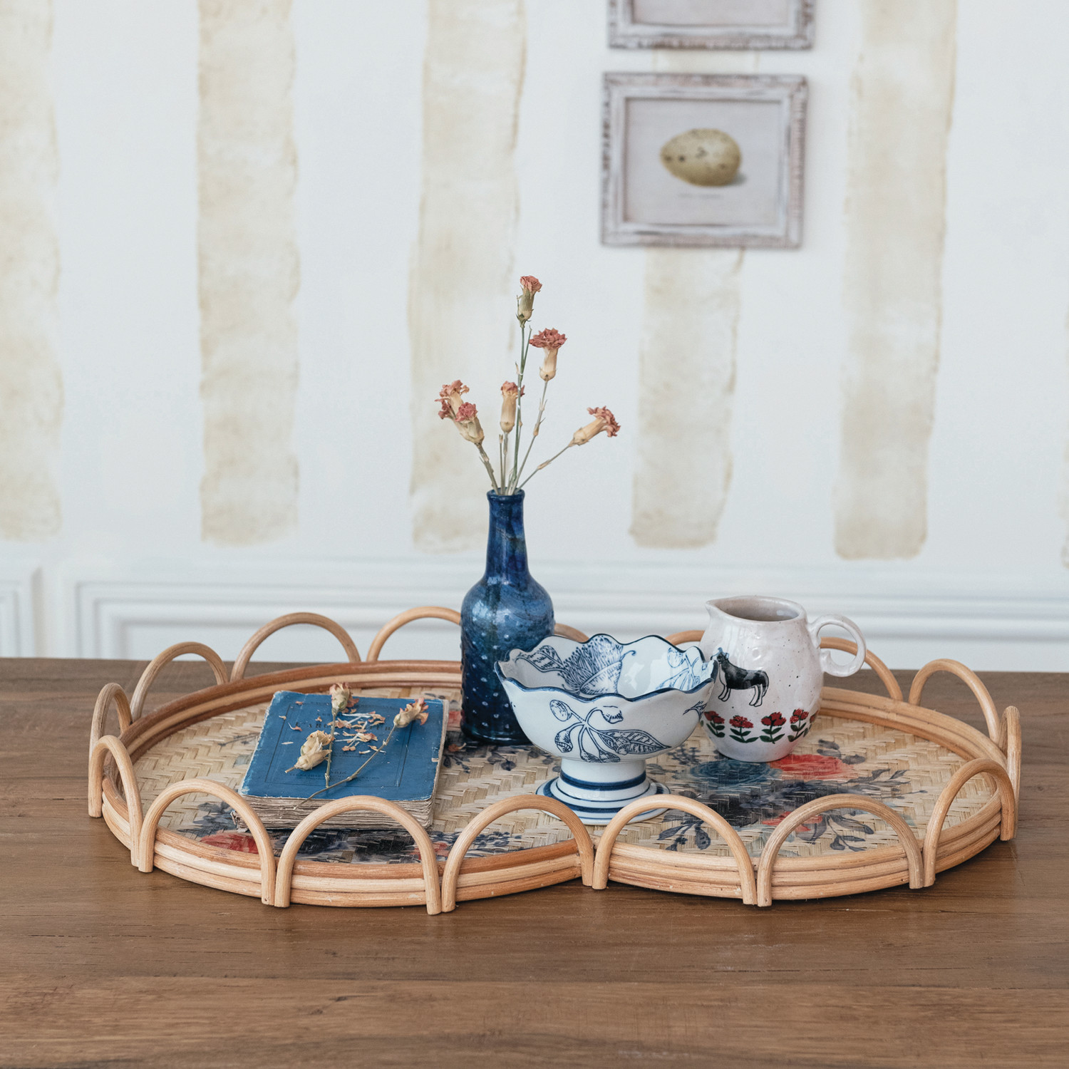 Catalog Name: 23-1/4"L x 15"W x 2-1/4"H Decorative Rattan, Bamboo & MDF Scalloped Tray w/ Printed Florals, Multi Color