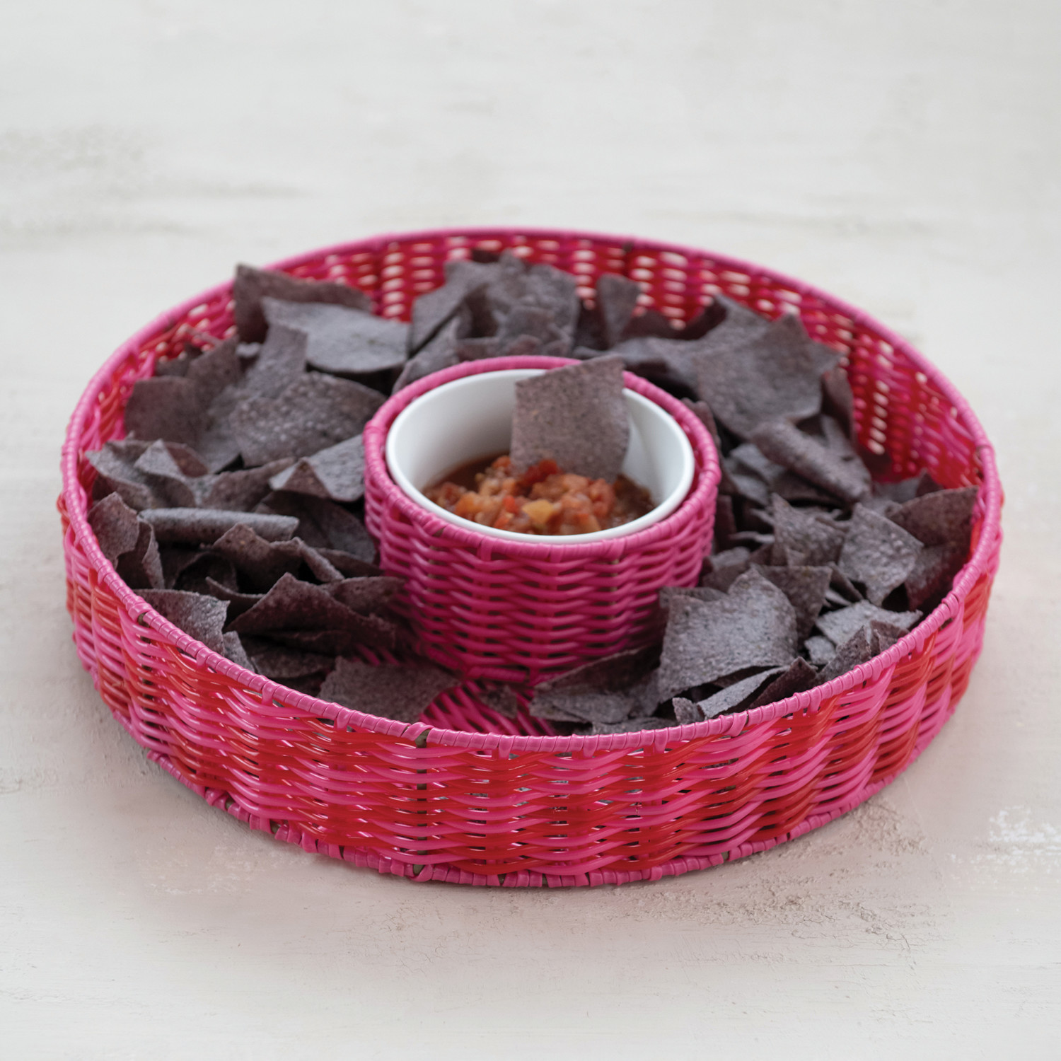 Catalog Name: 13-1/4" Round x 3"H Woven Plastic Chip & Dip Basket w/ 18 oz. Removable White Ceramic Bowl, Pink & Red, Set of 2